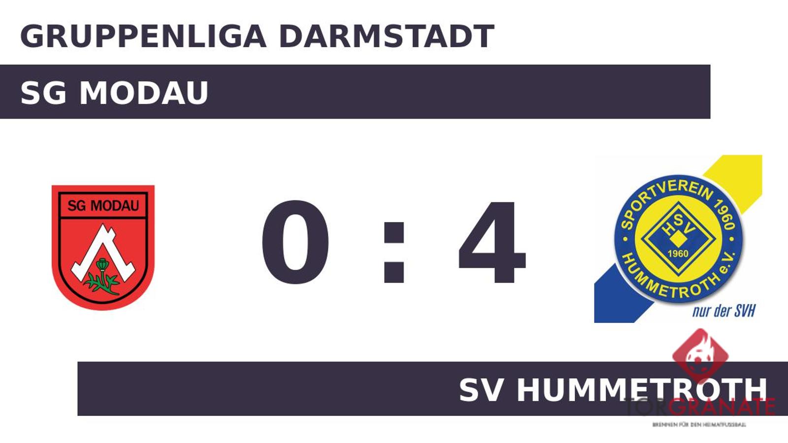 Kaum war das Spiel angepfiffen, lag der SV Hummetroth bereits in Front. Andreas Adamek markierte in der fünften Minute die Führung. Bereits in der 13. Minute erhöhte Daniele Toch den Vorsprung der Gäste. Am Zwischenstand änderte sich weiter nichts, sodass dieser auch gleichzeitig der Pausenstand war. In der 65. Minute legte Christopher Nguyen zum 3:0 zugunsten des SV Hummetroth nach. Wenig später kamen Stiva Saettler und Alessandro Ali per Doppelwechsel für Okyay Ermis und Deniz Oezkaya auf Seiten der SG Modau ins Match (69.). Adamek besorgte in der Schlussphase schließlich den vierten Treffer für den SV Hummetroth (77.). Schlussendlich feierte der SV Hummetroth einen gelungenen Saisonauftakt. Gegen die SG Modau kam der SV Hummetroth zu einem verdienten 4:0-Sieg.
