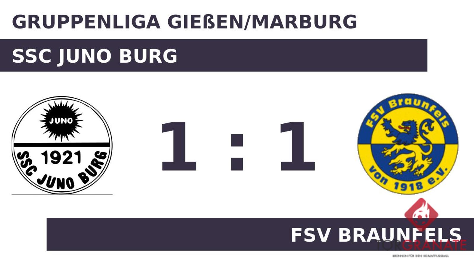 Die erste Halbzeit endete ohne ein zählbares Ereignis für beide Mannschaften. Mit einem Wechsel – Jan Petruschke kam für Nicolai Göbel – startete Juno Burg in Durchgang zwei. Felix Kessler brach für die Heimmannschaft den Bann und markierte in der 60. Minute die Führung. Wenig später kamen Tim Junker und Philipp Dapper per Doppelwechsel für Luis Weitzel und Luca Krieger auf Seiten von SSC Juno Burg ins Match (66.). Wer glaubte, der FSV Braunfels sei geschockt, irrte. Faruk Kaya machte unmittelbar nach dem Rückschlag den Ausgleich perfekt (66.). Letzten Endes gewann niemand die Oberhand, sodass sich Juno Burg und Braunfels die Punkte teilten.