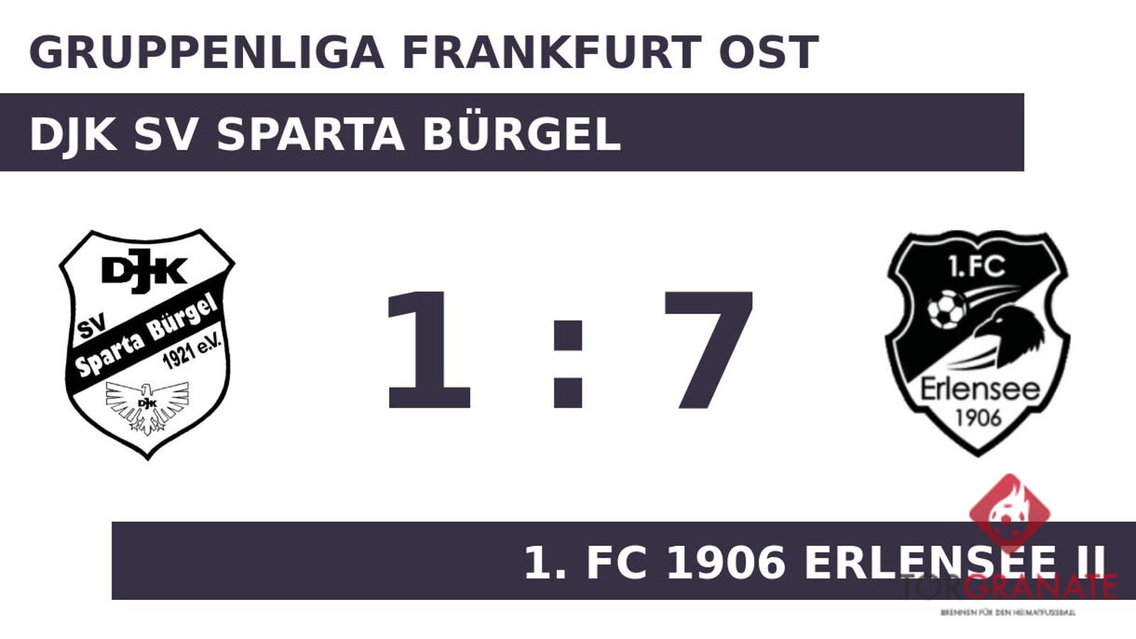Der 1. FC Erlensee II musste den Treffer von Prince Ofili zum 1:0 hinnehmen (12.). Wer glaubte, die Gäste seien geschockt, irrte. Erik Reutter machte unmittelbar nach dem Rückschlag den Ausgleich perfekt (17.). Philipp Müller sorgte mit einem lupenreinen Hattrick für das 4:1 (20./31./36.) aus der Perspektive des Tabellenführers. Nach nur 30 Minuten verließ Sebastian Fiat vom DJK SV Sparta Bürgel das Feld, Douglas Eion Macleod kam in die Partie. Der 1. FC 1906 Erlensee II dominierte den Gegner zur Pause nach Belieben und ging mit einer deutlichen Führung in die Kabine. Für den DJK SV Sparta Bürgel war es ein Tag zum Vergessen. K. A. (46.), k.A. k.A. (61.) und Amadou Diallo (63.) machten das Unheil perfekt. Mit einem Wechsel – Marko Grüger kam für Diego Jonathan da Silva – startete die Heimmannschaft in Durchgang zwei. Wenig später kamen Fabian Luehrs und Denzel Epps per Doppelwechsel für Reutter und Diallo auf Seiten des 1. FC Erlensee II ins Match (65.). Schlussendlich reklamierte der 1. FC 1906 Erlensee II einen Sieg in der Fremde für sich und wies den DJK SV Sparta Bürgel mit 7:1 in die Schranken.