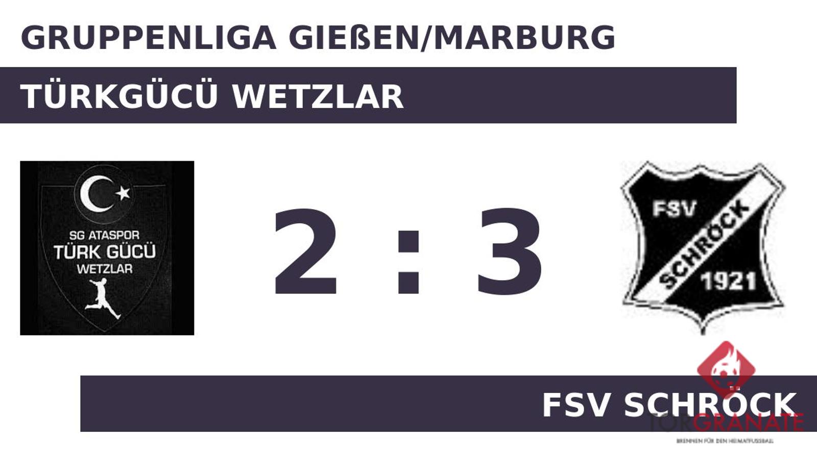 In der zehnten Minute brachte Mehmet Pektas den Ball im Netz der Schröcker unter. Adem Memis musste nach nur 20 Minuten vom Platz, für ihn spielte Mert Tuerk weiter. Mit der knappen Führung der Türkgücü Wetzlar pfiff der Schiedsrichter zur Halbzeit. Cedric Löwer witterte seine Chance und schoss den Ball zum 1:1 für den FSV Schröck ein (58.). Marcel Schmitt brachte die Türkgücü Wetzlar per Doppelschlag ins Hintertreffen, als er in der 76. und 86. Minute vollstreckte. Kurz vor dem Ende des Spiels nahm der FSV Schröck noch einen Doppelwechsel vor, sodass Niels Lemmer und Danny Dietz für Toki Hiromoto und Sadath Mohamed Abdoulaye weiterspielten (87.). Kurz vor Ultimo war noch Semih Kahveci zur Stelle und zeichnete für das zweite Tor der Türkgücü Wetzlar verantwortlich (90.). Am Ende schlug der FSV Schröck das Heimteam auswärts.