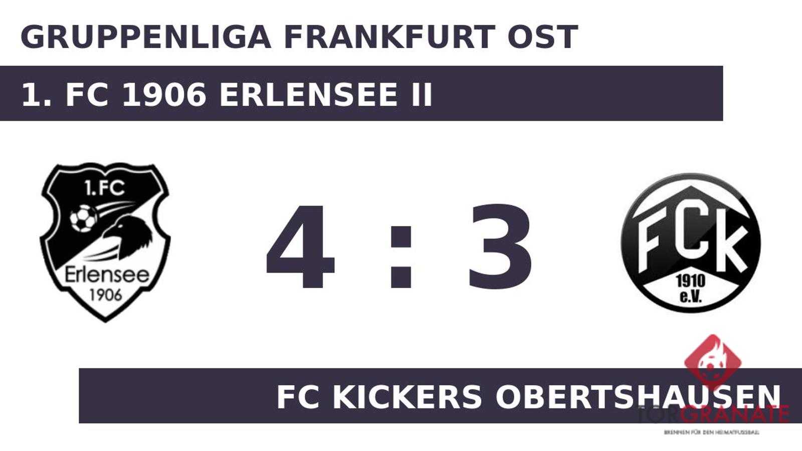 Nach nur 28 Minuten verließ Rene Becker vom 1. FC Erlensee II das Feld, Markus Wagner kam in die Partie. Daniel Bacher brachte sein Team in der 33. Minute nach vorn. Philipp Müller sicherte dem 1. FC 1906 Erlensee II nach 35 Minuten den Ausgleich durch einen Elfmeter. Vor dem Seitenwechsel sorgte Patrick Scheiner mit seinem Treffer für eine kalte Dusche für die Heimmannschaft. Der FC Kickers Obertshausen führte zur Halbzeit knapp mit einem Tor Vorsprung. Der 1. FC Erlensee II zeigte sich unbeeindruckt und so drehten Max Haehnichen (46.) und k. A. (52.) mit ihren Treffern das Spiel. Den Freudenjubel des 1. FC 1906 Erlensee II machte Jan Gebhardt zunichte, als er kurz darauf den Ausgleich besorgte (54.). Eine Minute später ging der 1. FC Erlensee II durch den zweiten Treffer von A. in Führung. Kurz vor dem Ende des Spiels nahm der 1. FC 1906 Erlensee II noch einen Doppelwechsel vor, sodass Luca Gesch und k. A. für k. A. und Müller weiterspielten (90.). Als der Schiedsrichter die Begegnung beim Stand von 4:3 letztlich abpfiff, hatte der 1. FC Erlensee II die drei Zähler unter Dach und Fach.