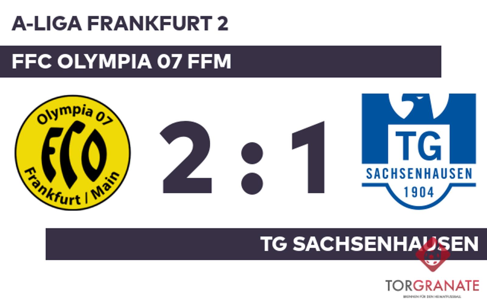 Marco Matschewski stellte die Weichen für das Heimteam auf Sieg, als er in Minute 15 mit dem 1:0 zur Stelle war. Leon Stelzer versenkte die Kugel zum 2:0 für den FFC Olympia 07 Ffm (35.) Mit der Führung für den FFC Olympia 07 Ffm ging es in die Kabine. Marek Heinzelmann traf zum 1:2 zugunsten der TG Sachsenhausen (90.). Obwohl dem FFC Olympia 07 Ffm nach erfolgreicher erster Hälfte keine weiteren Tore gelangen, schaffte es die TG Sachsenhausen zugleich nicht, die Partie zu drehen. Sie endete mit 2:1.