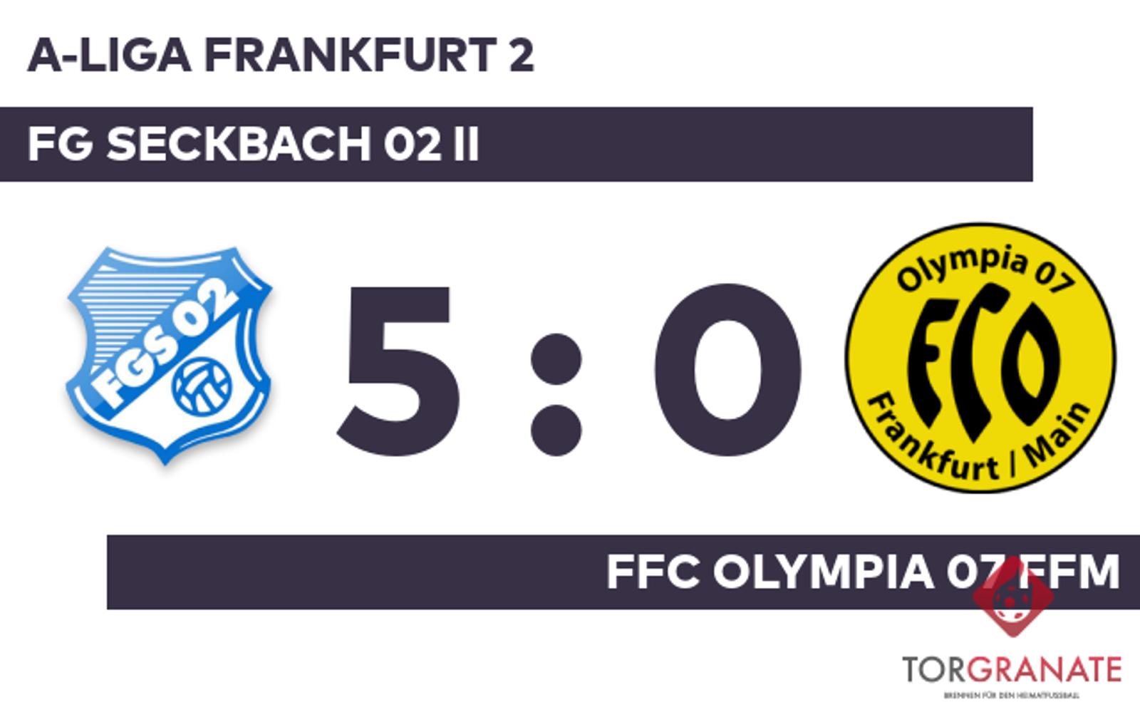 Ein Doppelpack brachte den Gastgeber in eine komfortable Position: Ali Wardak war gleich zweimal zur Stelle (15./24.). Mit der Führung für die FG Seckbach 02 II ging es in die Halbzeitpause. In der Pause stellte der FFC Olympia 07 Ffm personell um: Per Doppelwechsel kamen Stefan Hendrich und Barry Basadou auf den Platz und ersetzten Jean-Julien Gusmao-Parizon und Florian Schwarz. In der 70. Minute legte Adrian Paul Sumanariu zum 3:0 zugunsten der FG Seckbach 02 II nach. Ivan Bogdan Hartmann schraubte das Ergebnis in der 72. Minute mit dem 4:0 für die FG Seckbach 02 II in die Höhe. Wilhelm Robert Menning besorgte in der Schlussphase schließlich den fünften Treffer für die FG Seckbach 02 II (78.). Insgesamt reklamierte die FG Seckbach 02 II gegen den FFC Olympia 07 Ffm einen ungefährdeten Heimerfolg für sich.
