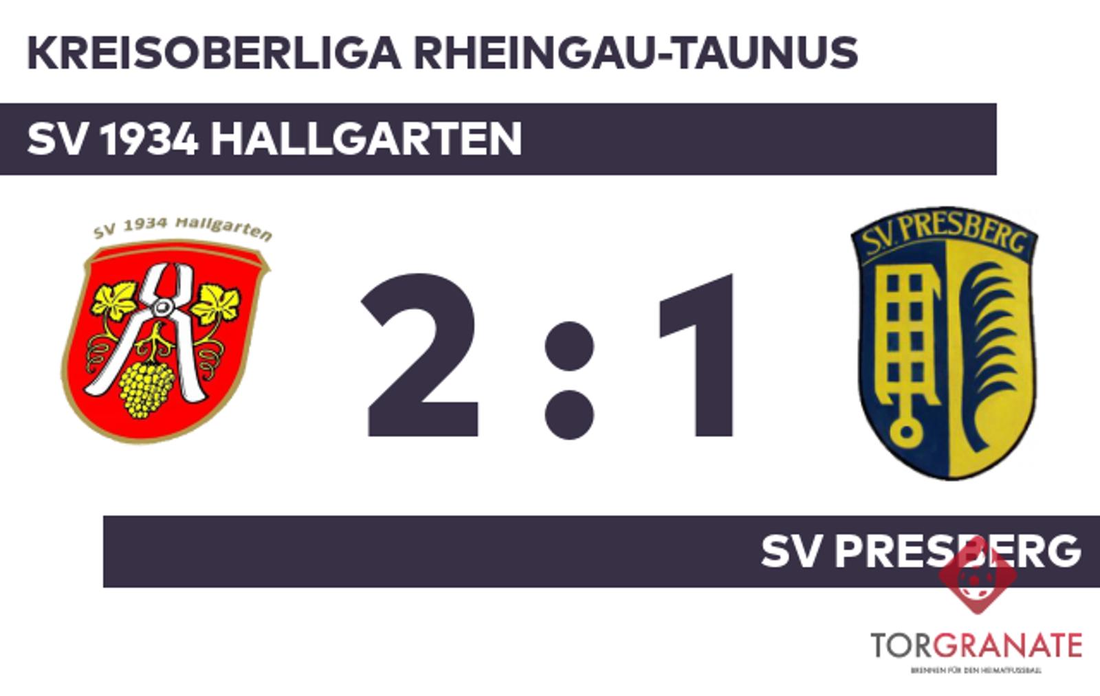 Durch einen Elfmeter von Christopher Hofmann gelang dem SV 1934 Hallgarten das Führungstor. Die Pausenführung des SV 1934 Hallgarten fiel knapp aus. Mit einem Wechsel – Marc Bonertz kam für Henri Solter – startete der SV 1934 Hallgarten in Durchgang zwei. In der 48. Minute erhöhte Moritz Jandl auf 2:0 für den SV 1934 Hallgarten. Nurullah Keskin, der von der Bank für Eyuep Eroglu kam, sollte für neue Impulse beim SV Presberg sorgen (53.). Das 1:2 der Gäste bejubelte Keskin (79.). Schließlich holte der SV 1934 Hallgarten gegen den direkten Abstiegskonkurrenten die Big Points und feierte einen 2:1-Sieg.