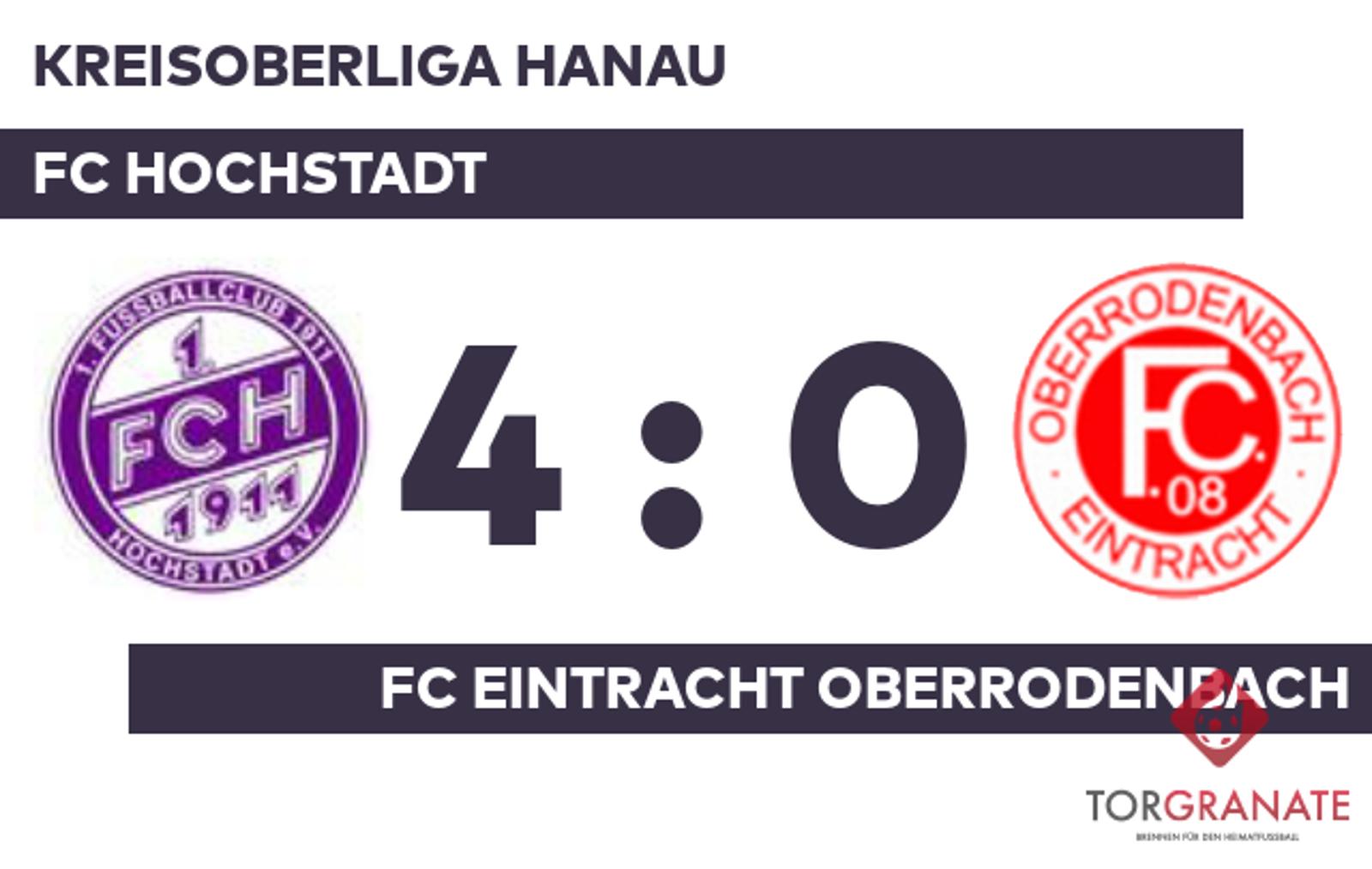 Für den Führungstreffer des FC Hochstadt zeichnete Sufian El Bakali Kassimi verantwortlich (15.). Kurz vor dem Halbzeitpfiff (45.) baute David Angersbach die Führung des FCH aus. Mit der Führung für die Hochstädter ging es in die Halbzeitpause. Mit dem 3:0 von El Bakali Kassimi für die Gastgeber war das Spiel eigentlich schon entschieden (58.). Eigentlich war der FC Eintracht Oberrodenbach schon geschlagen, als Jaouad El Kaddouri das Leder zum 0:4 über die Linie beförderte (62.). Am Schluss schlug der FC Hochstadt den FCO vor eigenem Publikum mit 4:0 und rief dabei eine souveräne Leistung ab.