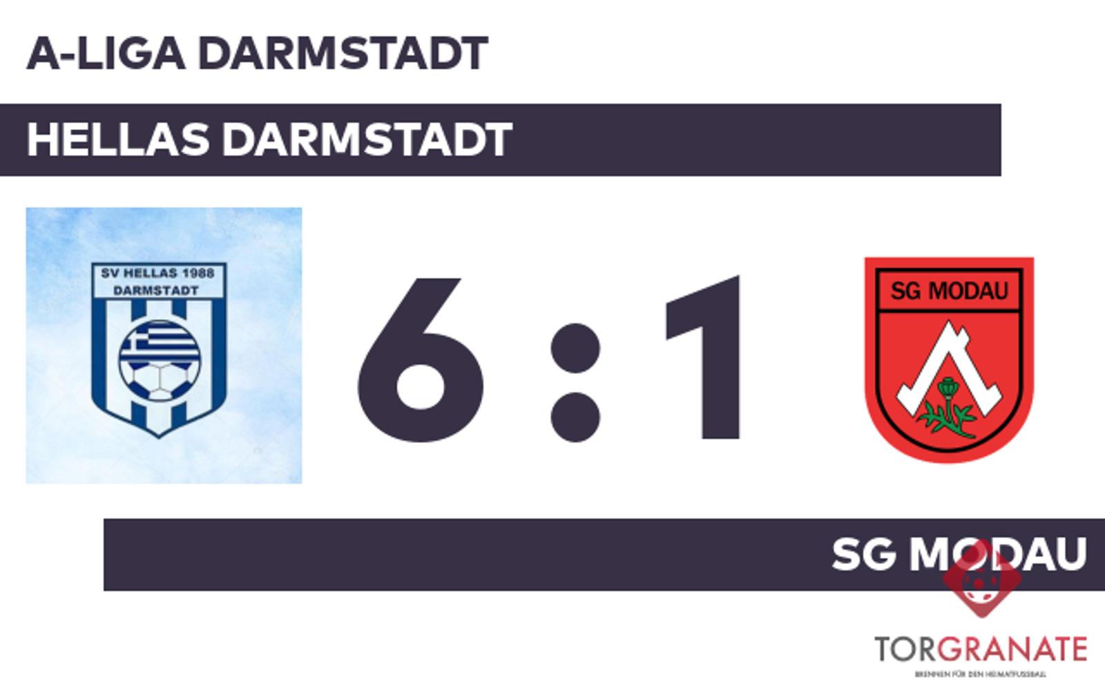 Theodoros Karras trug sich in der 30. Spielminute in die Torschützenliste ein. Kurz vor dem Seitenwechsel legte Özkan Altunbas das 2:0 nach (40.). Mit der Führung für das Hellas Darmstadt ging es in die Halbzeitpause. Der dritte Streich der Heimmannschaft war Kiriakos Karras vorbehalten (55.). In der 65. Minute legte Georgios Karipidis zum 4:0 zugunsten des Hellas Darmstadt nach. Kazeem Adedokun erzielte in der 73. Minute den Ehrentreffer für die SG Modau. Altunbas (81.) und Theodoros Karras (84.) trafen innerhalb weniger Minuten zur Vorentscheidung des Hellas Darmstadt. Am Ende kam das Hellas Darmstadt gegen die SG Modau zu einem verdienten Sieg.