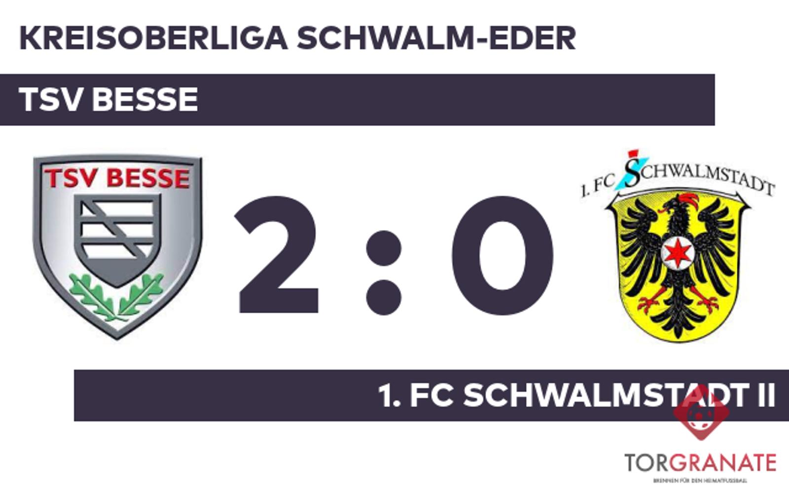 In der Anfangsphase schaffte es keines der beiden Teams, sich eine Chance zu erarbeiten. Durch einen Elfmeter von David Huy gelang dem TSV Besse das Führungstor. Leroy Bawuah versenkte die Kugel zum 2:0 für das Heimteam (39.) Mit der Führung für den TSV Besse ging es in die Kabine. Den Grundstein für den Sieg über Schwalmstadt II legte der TSV Besse bereits in Halbzeit eins. Da in Durchgang zwei keine weiteren Treffer mehr fielen, war der Pausenstand am Ende auch das Endergebnis.