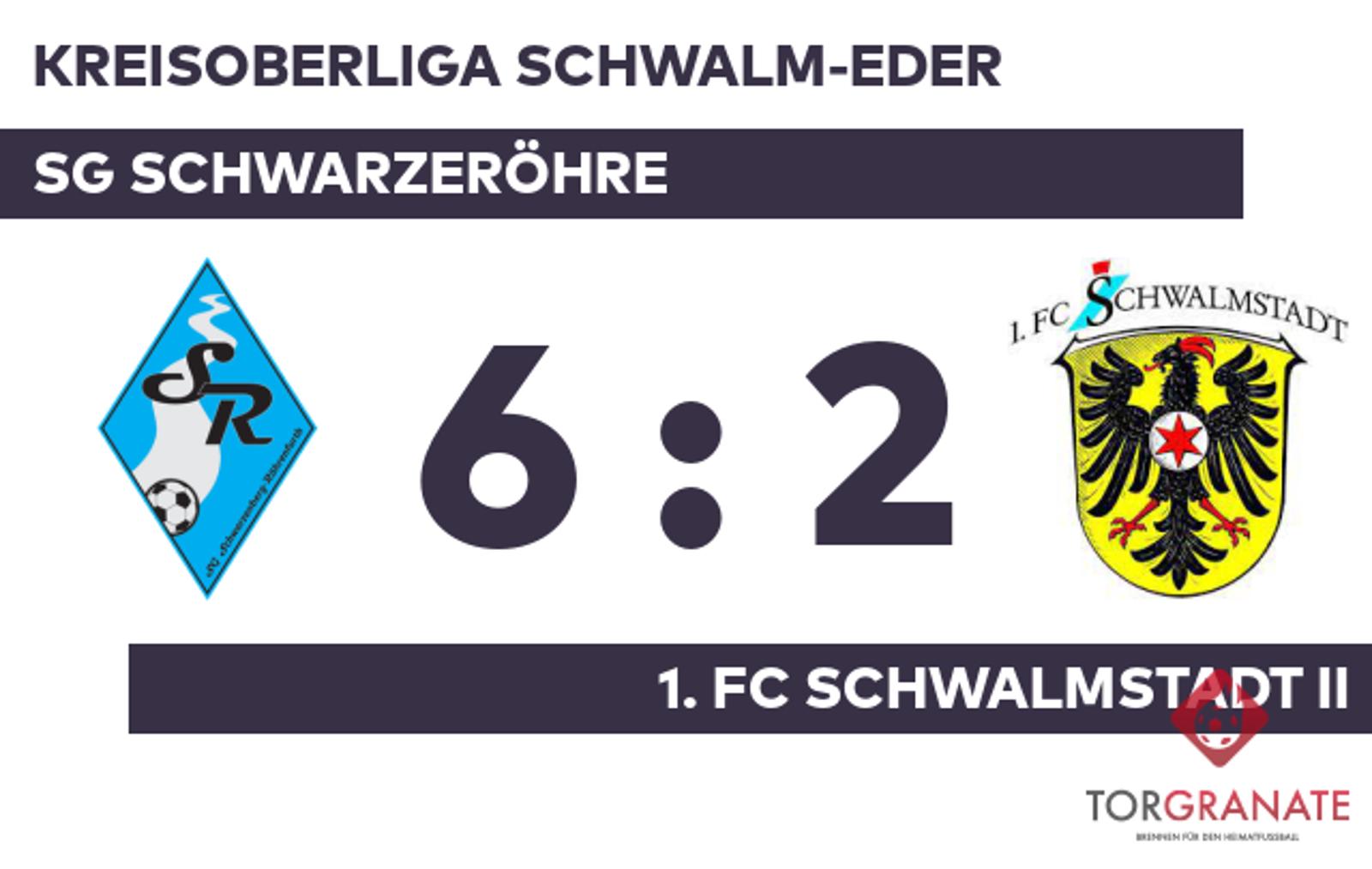 Nico Schumann trug sich in der siebten Spielminute in die Torschützenliste ein. Den Freudenjubel der SG SchwarzeRöhre machte Valentin Best zunichte, als er kurz darauf den Ausgleich besorgte (11.). Arlind Kastrati versenkte die Kugel zum 2:1 (25.). Für die Vorentscheidung waren Sükrü Yüksel (41.) und Schumann (44.) mit zwei schnellen Treffern verantwortlich. Zur Halbzeit blickte die SG SchwarzeRöhre auf einen klaren Vorsprung gegen einen Gegner, den man deutlich beherrschte. Ruslan Musin (58.) und Nicolas Reibenspies (59.) brachten die Heimmannschaft mit zwei schnellen Treffern weiter nach vorne. Mit dem Treffer zum 2:6 in der 72. Minute machte Best zwar seinen Doppelpack perfekt – der Rückstand zur SG SchwarzeRöhre war jedoch weiterhin gewaltig. Letztlich hat Schwalmstadt II den Befreiungsschlag klar verpasst. Gegen den direkten Widersacher um den Klassenverbleib, die SG SchwarzeRöhre, bekam man das Fell über die Ohren gezogen.