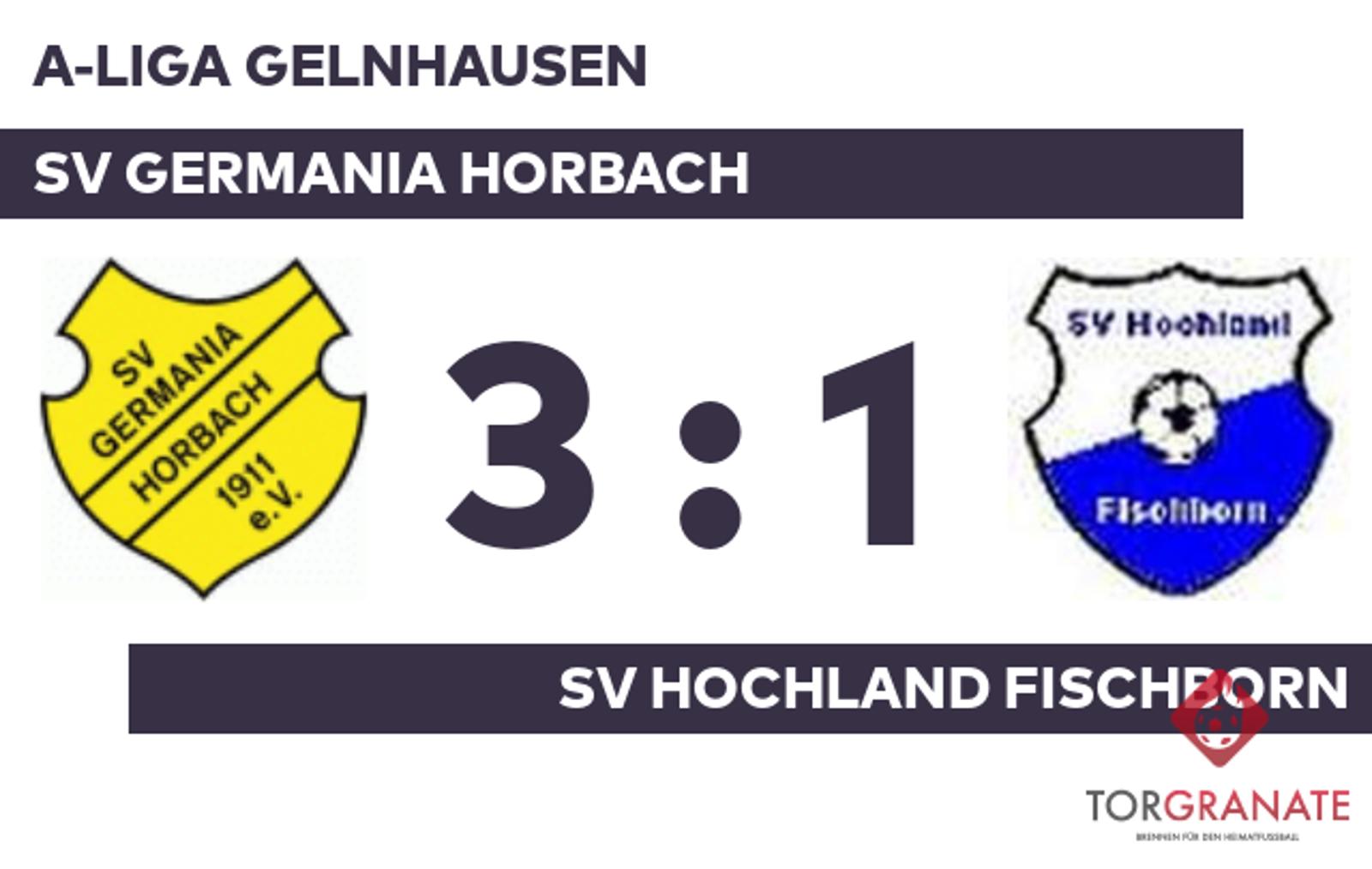 Für den Führungstreffer des SVG zeichnete Felix Peter verantwortlich (26.). Die Antwort ließ nicht lange auf sich warten. Wenige Augenblicke später besorgte Ole Schneider den Ausgleich (30.). Bis zur Pause fiel kein weiteres Tor, sodass es schließlich mit unverändertem Ergebnis in die Kabinen ging. Dass der SV Germania Horbach in der Schlussphase auf den Sieg hoffte, war das Verdienst von Damian Michael Krebs, der in der 75. Minute zur Stelle war. Manuel Stadler erhöhte den Vorsprung der Germanen nach 80 Minuten auf 3:1. Am Schluss schlug der SV Germania Horbach den SV Fischborn mit 3:1.