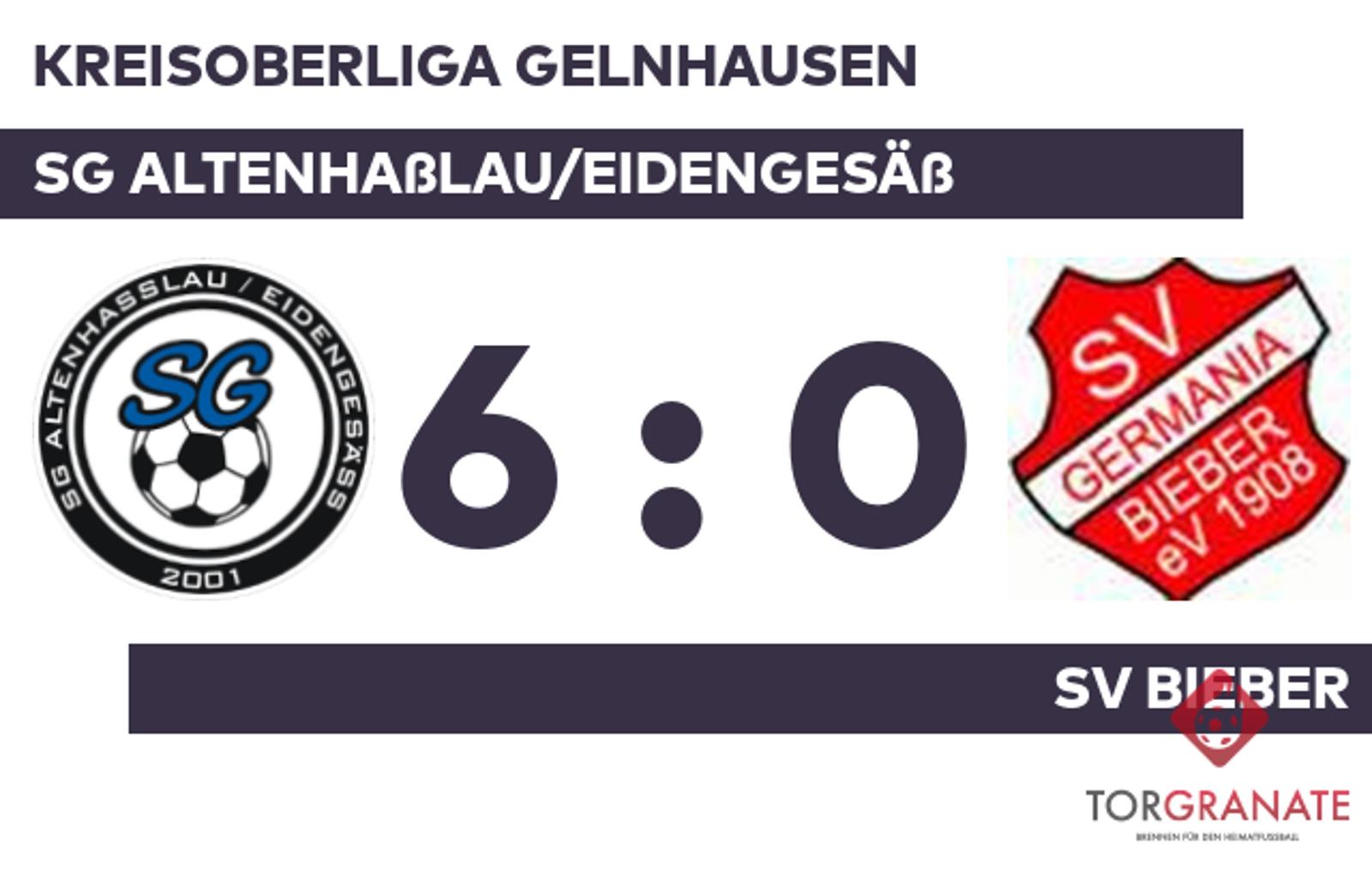 Mit einem schnellen Doppelpack (16./21.) zum 2:0 schockte Nader Barhouche den SV Bieber. Den Vorsprung der SG Altenhaßlau/Eidengesäß ließ Christoph Geiger in der 26. Minute anwachsen. Nach nur 28 Minuten verließ Mick Weigand vom SV Bieber das Feld, Mike Rieger kam in die Partie. In der 31. Minute verwandelte Enrico Pappert einen Elfmeter zum 4:0 für das Altenhaßlau/Eid. Jonas Behnsen überwand den gegnerischen Schlussmann zum 5:0 für die Zweier-Spielgemeinschaft (34.). Der SV Bieber sah in Durchgang eins kein Land und lag zur Pause unaufholbar zurück. Zum Seitenwechsel ersetzte Felix Rausch vom SVB seinen Teamkameraden Calogero Capobianco. Eigentlich war die Germania schon geschlagen, als Pappert das Leder zum 0:6 über die Linie beförderte (68.). Frank Kunold (Frankfurt am Main) pfiff schließlich das Spiel ab, in dem die SG Altenhaßlau/Eidengesäß bereits in Durchgang eins deutlich gezeigt hatte, dass es nach 90 Minuten nur einen Sieger geben würde.