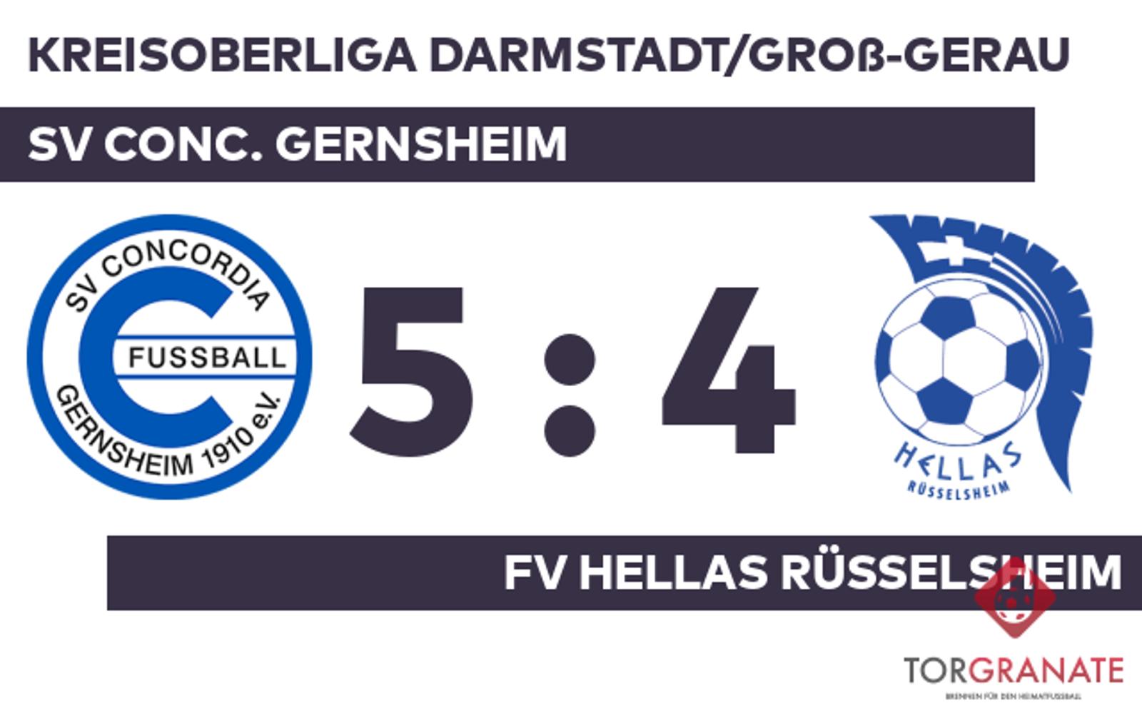 Daniel-Mihai Albu brachte den Ball zum 1:0 zugunsten des FV Hellas Rüsselsheim über die Linie (1.). Pascal Sattler war zur Stelle und markierte das 1:1 des SV Conc. Gernsheim (12.). Die nächsten beiden Treffer waren einem Mann vorbehalten: Merlin Treuer schnürte einen Doppelpack (36./45.), sodass die Heimmannschaft fortan mit 3:1 führte. Mit der Führung für den Tabellenletzten ging es in die Kabine. Mit dem zweiten Treffer von Albu rückte das Hellas Rüsselsheim wieder ein wenig an den SV Conc. Gernsheim heran (53.). Das 4:2 für den SV Conc. Gernsheim stellte Sattler sicher. In der 57. Minute traf er zum zweiten Mal während der Partie. Ibrahim Darghazi verkürzte für den FV Hellas Rüsselsheim später in der 65. Minute auf 3:4. Treuer erhöhte den Vorsprung des SV Conc. Gernsheim nach 81 Minuten auf 5:3. Ioannis Safis versenkte den Ball in der 82. Minute im Netz des SV Conc. Gernsheim. Als der Unparteiische Younes Moullig (Dietzenbach) die Partie abpfiff, reklamierte der SV Conc. Gernsheim schließlich einen 5:4-Heimsieg für sich.