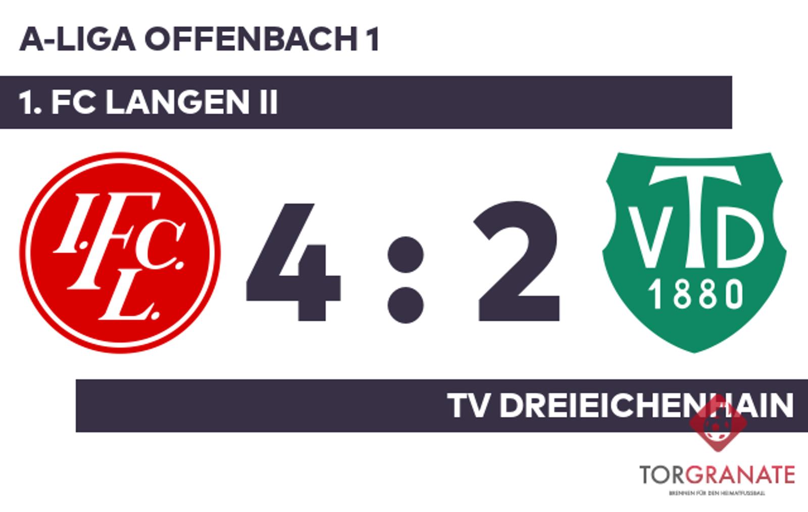 Nils Rödling brachte den TV Dreieichenhain in der zwölften Minute ins Hintertreffen. Nils Rödling musste nach nur 19 Minuten vom Platz, für ihn spielte Paul Sauerborn weiter. Die Führung hielt allerdings nur acht Minuten. Ein Eigentor brachte den Ausgleich für den TV Dreieichenhain (20.). Baba Mouhaman verwandelte in der 22. Minute einen Elfmeter und brachte dem 1. FC Langen II die 2:1-Führung. Kurz vor dem Pausenpfiff erhöhte Fabio Mola den Vorsprung der Heimmannschaft auf 3:1 (40.). Mit der Führung für den 1. FC Langen II ging es in die Kabine. Zum Seitenwechsel ersetzte Marc Kieffer vom TV Dreieichenhain seinen Teamkameraden Dalil Habo. Für das 4:1 des 1. FC Langen II sorgte Julian Obermeier, der in Minute 66 zur Stelle war. Für das zweite Tor des TV Dreieichenhain war Florian Werkmann verantwortlich, der in der 82. Minute das 2:4 besorgte. Schlussendlich verbuchte der 1. FC Langen II gegen den Gast einen überzeugenden Heimerfolg.