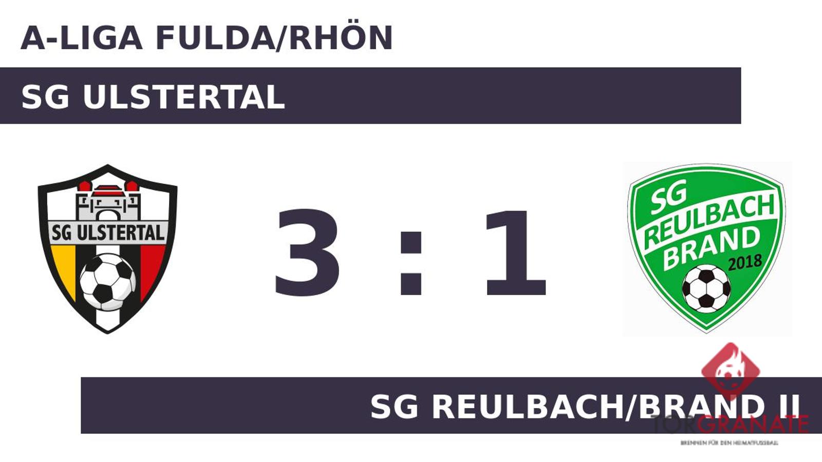 Nach den ersten 45 Minuten ging es für die Ulstertaler und Reulbach/Brand II ohne Torerfolg in die Kabinen. Morro Jammeh brachte sein Team in der 51. Minute nach vorn. Aniello Colella verwandelte in der 55. Minute einen Elfmeter und baute den Vorsprung der SG Ulstertal auf 2:0 aus. Für das 1:2 der SG Reulbach/Brand II zeichnete Felix Faulstich verantwortlich (62.). Das 3:1 für die SG Ulstertal stellte Colella sicher. In der 82. Minute traf er zum zweiten Mal während der Partie. Am Ende verbuchte die SG Ulstertal gegen Reulbach/Brand II einen Sieg.
