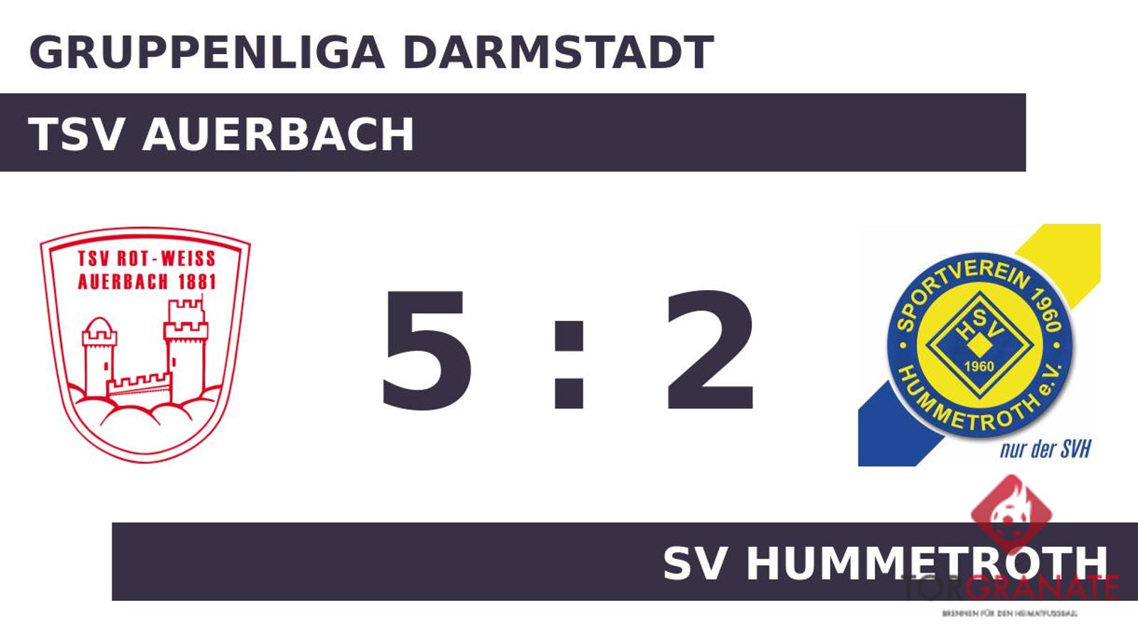 Nico Jäger brachte den TSV Auerbach in der 35. Minute nach vorn. Die Heimmannschaft baute den Vorsprung mit der Hilfe des Gegners weiter aus: 2:0 für den TSV Auerbach durch ein Eigentor des SV Hummetroth in der 44. Minute. Mit der Führung für den TSV Auerbach ging es in die Halbzeitpause. In der Halbzeit nahm der SV Hummetroth gleich zwei Wechsel vor. Fortan standen Marcelo Abraham Manfredini und Samir El Fahfouhy für Daniele Toch und Mehmet Yildirim auf dem Platz. Für das 1:2 der Gäste zeichnete Giuseppe Burgio verantwortlich (74.). Zwei schnelle Treffer von Linus Dietzsch (80.) und Rene Brunner (84.) sorgten für die Vorentscheidung zugunsten des TSV Auerbach. Abraham Manfredini beförderte das Leder zum 2:4 des SV Hummetroth über die Linie (86.). Brunner stellte wenige Minuten vor dem Schlusspfiff den Stand von 5:2 für den TSV Auerbach her (88.). Ein starker Auftritt ermöglichte dem TSV Auerbach am Sonntag einen ungefährdeten Erfolg gegen den SV Hummetroth.