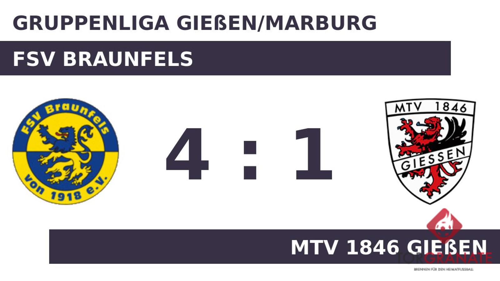Für Yannik Thielemeier war der Einsatz nach acht Minuten vorbei. Für ihn wurde Daniel Glanz eingewechselt. Maik Magera brachte sein Team in der zwölften Minute nach vorn. Bereits in der 15. Minute erhöhte Carmine Giuseppe Troncone den Vorsprung des FSV Braunfels. Daniel Carl nutzte die Chance für den MTV Gießen und beförderte in der 37. Minute das Leder zum 1:2 ins Netz. Braunfels hatte zur Pause eine knappe Führung auf dem Zettel stehen. Sukauthan Nitharsan beförderte das Leder zum 3:1 der Braunfelser über die Linie (51.). Faruk Kaya überwand den gegnerischen Schlussmann zum 4:1 für den FSV (79.). Kurz vor dem Ende des Spiels nahm das Heimteam noch einen Doppelwechsel vor, sodass Onur Sentürk und Manuel Busik für Burim Zhegrova und Mert Ciraci weiterspielten (86.). Schließlich erlitt der MTV 1846 Gießen im direkten Aufeinandertreffen mit dem Abstiegskonkurrenten eine deutliche Niederlage.