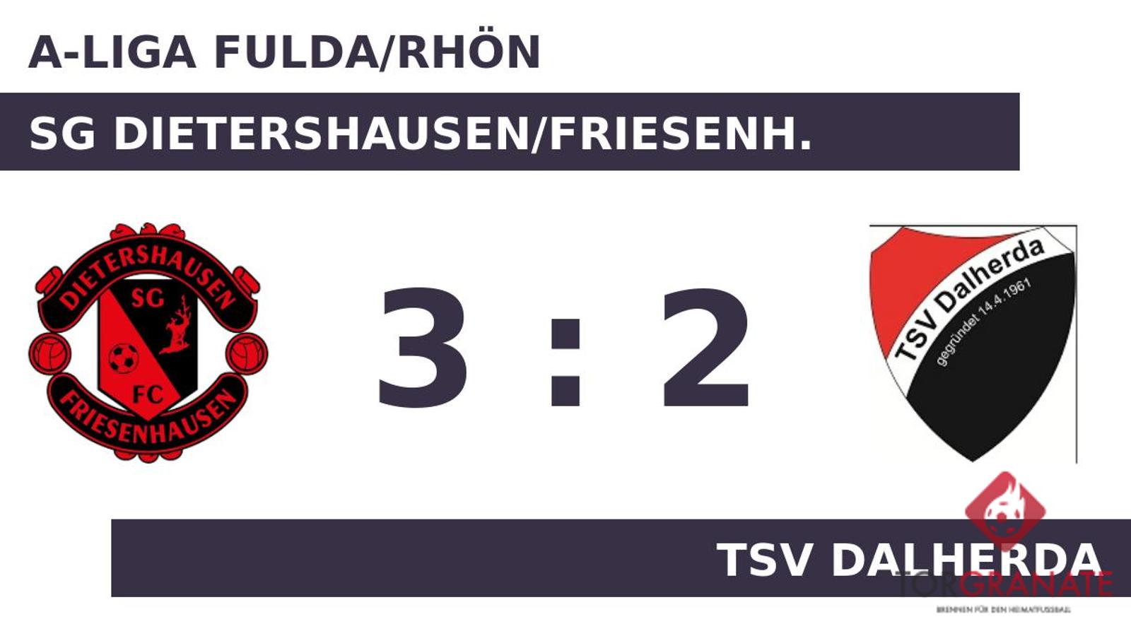 Die SG Dietershausen/Friesenh. geriet schon in der siebten Minute in Rückstand, als Leon Klüh das schnelle 1:0 für TSV Dalherda erzielte. Für das 1:1 von Dietershausen/F. zeichnete Marcel Müglich verantwortlich (37.). Zur Halbzeit war die Partie noch vollkommen offen. Remis lautete das Zwischenresultat. Eine Minute später ging die SG Dietershausen/Friesenh. durch den zweiten Treffer von Müglich in Führung. Rene Kolbe ließ sich in der 77. Minute nicht zweimal bitten und verwertete zum 2:2 für TSV Dalherda. Dominik Maierhof machte in der 84. Minute das 3:2 von Dietershausen/F. perfekt. Mit dem Schlusspfiff durch den Unparteiischen Uwe Döring (Schlitz) gewann die SG gegen TSV Dalherda.