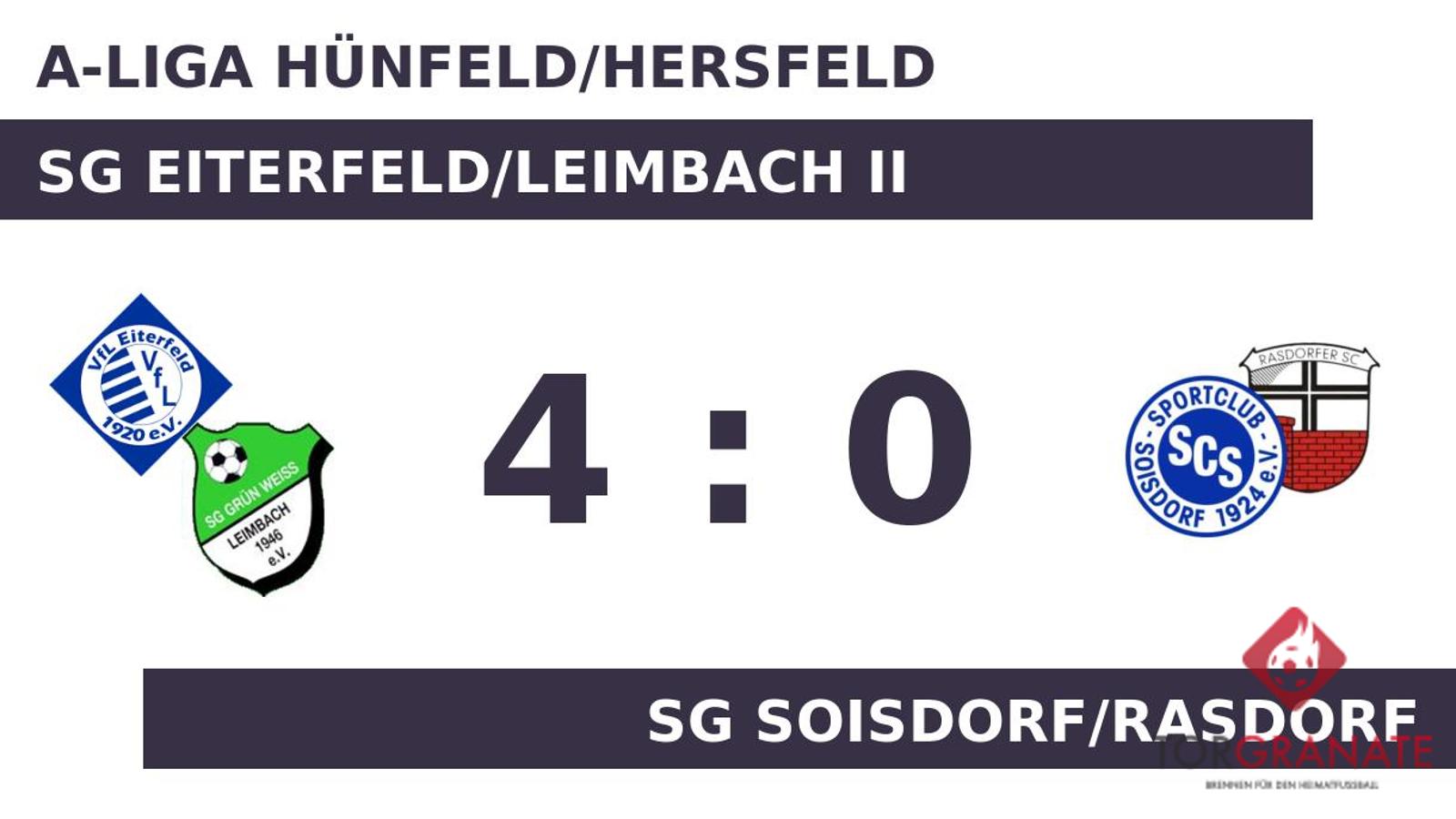 Durch den nie gefährdeten Sieg gegen die SG Soisdorf/Rasdorf festigte die SG Eiterfeld/Leimbach II den zweiten Tabellenplatz. Erfolgsgarant von Eiterf./Leimbach II ist die funktionierende Offensivabteilung, die mit 52 Treffern den Liga-Bestwert aufzeigt. Die SG Eiterfeld/Leimbach II weist in dieser Saison mittlerweile die stolze Bilanz von neun Erfolgen, drei Punkteteilungen und zwei Niederlagen vor. Den bitteren Geschmack einer Niederlage erlebte Eiterf./Leimbach II seit einiger Zeit nicht mehr. Exakt acht Spiele ist es her.