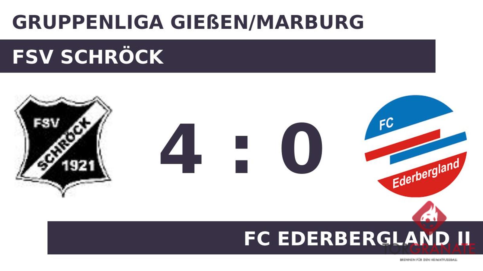 Marcel Schmitt schoss in der 35. Minute vom Elfmeterpunkt das erste Tor des Spiels für den FSV Schröck. Zur Pause behielten die Schröcker die Nase knapp vorn. Anstelle von Charlie Glanz war nach Wiederbeginn Jannik Schneider für den FC Ederbergland II im Spiel. Für das 2:0 und 3:0 war Schmitt verantwortlich. Der Akteur traf gleich zweimal ins Schwarze (50./61.). Wenig später kamen Miguel Latuszek und Marcel Seip per Doppelwechsel für Andreas Wilschke und Julian Kraus auf Seiten des FSV Schröck ins Match (74.). Bahtiyar Yildiran besorgte in der Schlussphase schließlich den vierten Treffer für den FSV (88.). Referee Moritz Mohr (Wetzlar) beendete schließlich das Spiel und somit kassierte Ederbergland II eine schmerzliche Niederlage gegen einen direkten Konkurrenten im Abstiegskampf.