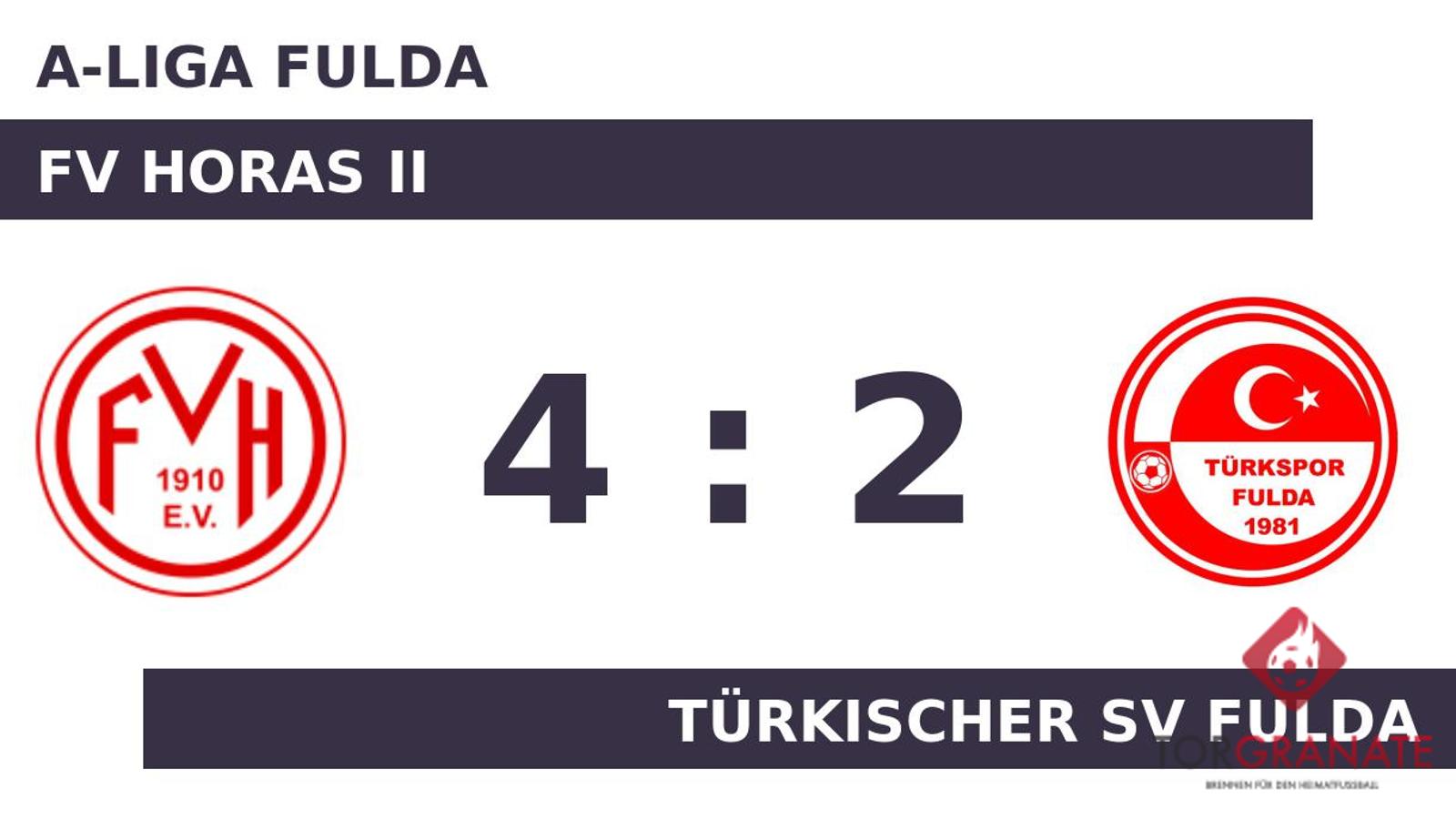 Jakob Heil brachte sein Team in der 13. Minute nach vorn. Noch bevor es in die Halbzeit ging, war Si Moon Mane mit dem 1:1 für den Türkischer SV zur Stelle (41.). Eine Aussage darüber, wer am Ende die Nase vorn haben würde, war nach dem Abpfiff der ersten Halbzeit noch nicht zu treffen. Es ging mit einem Gleichstand in die Kabinen. Thomas Fabrizius brachte den Ball zum 2:1 zugunsten des FV Horas II über die Linie (64.). In der 71. Minute erhöhte Jan Philipp Ulrich auf 3:1 für den FVH. Für ruhige Verhältnisse sorgte Irfan Sejdovic, als er das 4:1 für den FV besorgte (77.). In der 80. Minute brachte Ali Kabakci das Netz für den Türkischer SV Fulda zum Zappeln. Letzten Endes ging der FV Horas II im Duell mit dem TSV als Sieger hervor.