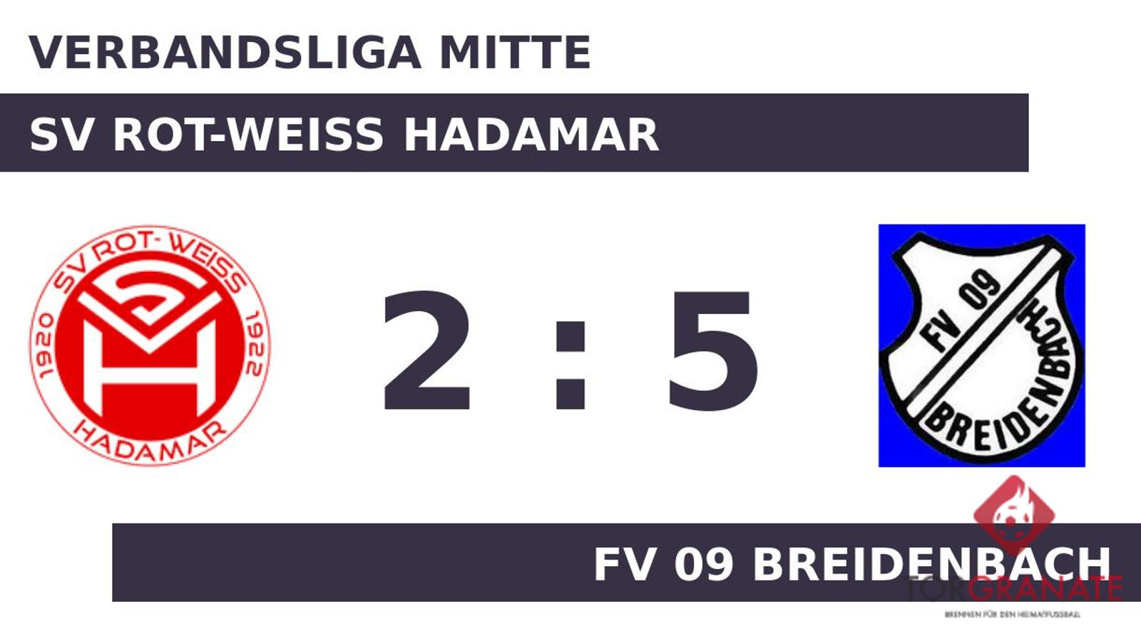 Der FV 09 Breidenbach ging durch Felix Baum in der 25. Minute in Führung. Zum psychologisch ungünstigen Zeitpunkt vor der Halbzeit (45.) schoss Luca Vogel einen weiteren Treffer für den Traditionsverein aus dem Hinterland. Es waren die Gäste, die zur Pause eine Führung ihr Eigen nannten. Caleb Robert Murphy verkürzte für Rot-Weiss Hadamar später in der 53. Minute auf 1:2. Die komfortable Halbzeitführung des FV 09 Breidenbach hielt nicht bis zum Abpfiff, denn Matthias Neugebauer schoss den Ausgleich in der 56. Spielminute. Die Nullneuner drängten im Verlauf auf die Entscheidung – Nils Cakar (60.), Vogel (64.) und Baum (81.) machten SV Rot-Weiss Hadamar den Garaus. In der 66. Minute stellte Rot-Weiss Hadamar personell um: Per Doppelwechsel kamen Viktors Geraskins und Samim Mansur auf den Platz und ersetzten Kerim Hindic und Alem Koljic. Letztlich fuhr der FV 09 Breidenbach einen souveränen Erfolg ein, dessen Grundstein im ersten Spielabschnitt gelegt worden war.