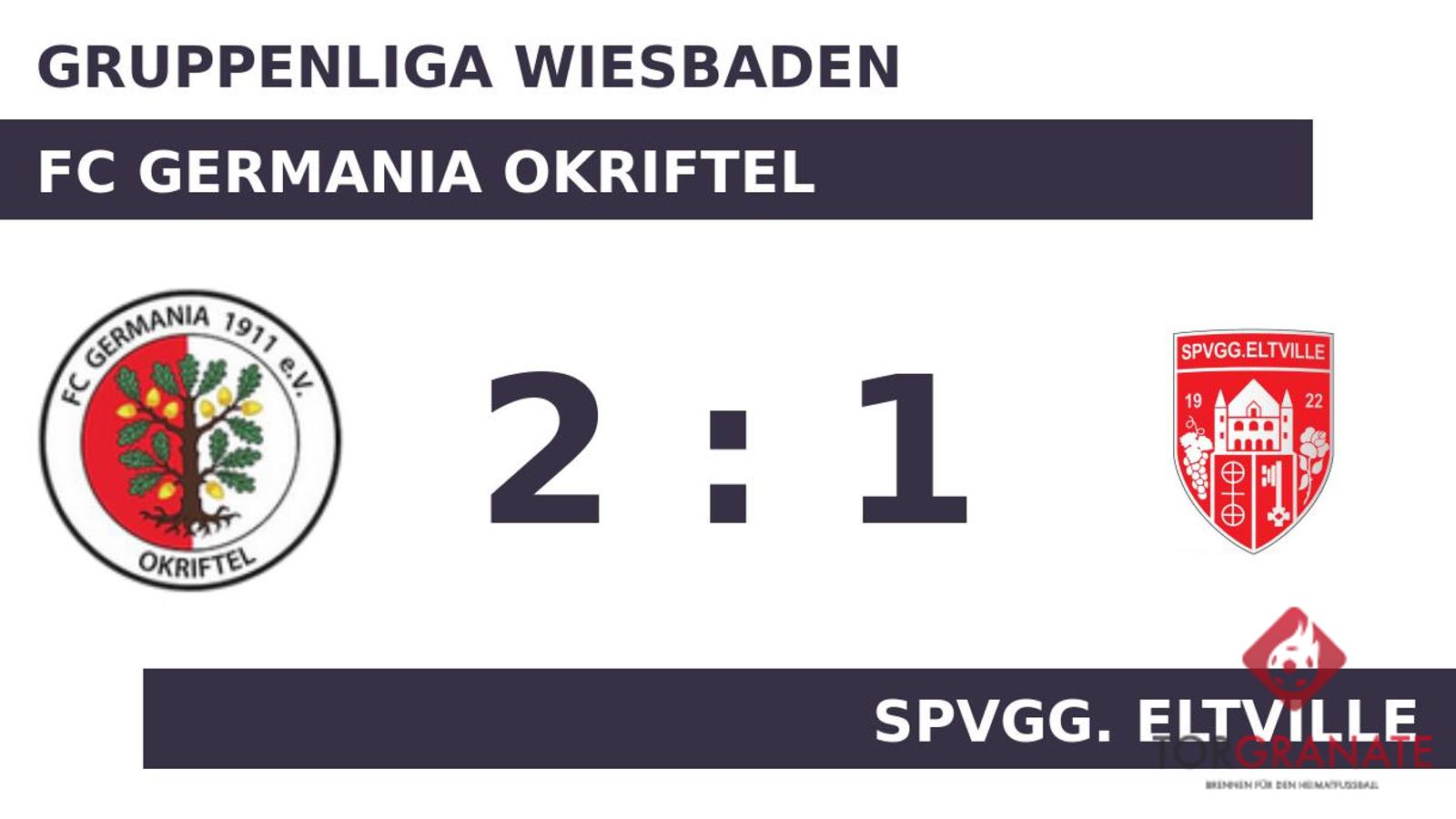 Kaum war das Spiel angepfiffen, lag der FC Germania Okriftel bereits in Front. Alim Göcek markierte in der fünften Minute die Führung. Bei der Spvgg. Eltville kam zu Beginn der zweiten Hälfte Can Taleghani für Gentrit Haxhosaj in die Partie. Der Schiedsrichter schickte schließlich beide Mannschaften ohne weitere Änderung am Spielstand in die Kabinen. Göcek schnürte mit seinem zweiten Treffer einen Doppelpack und brachte seine Mannschaft auf die Siegerstraße (59.). Vin Fachinger war es, der in der 77. Minute das Spielgerät im Tor der Germania Okriftel unterbrachte. In der 80. Minute stellte die Spvgg. Eltville personell um: Per Doppelwechsel kamen Takami Abe und Florian Buecker auf den Platz und ersetzten David Sarris und Fabio Enders. Nach der Beendigung des Spiels durch den Unparteiischen Tim Deisenroth (Heusenstamm) feierte der FC Germania Okriftel einen dreifachen Punktgewinn gegen die Spvgg. Eltville.