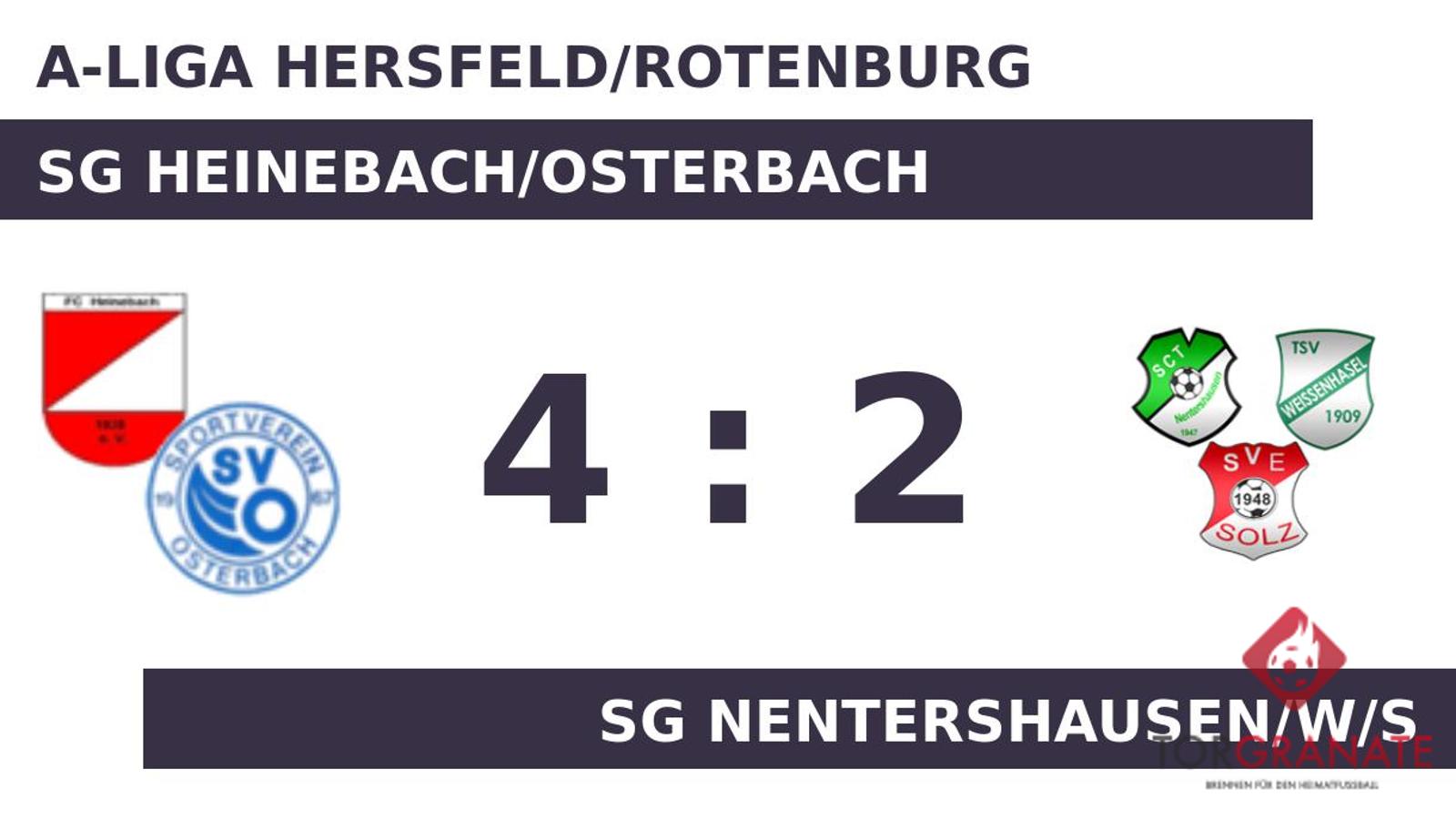 John Raabe brachte die SG NWS in der zehnten Minute ins Hintertreffen. Die passende Antwort hatte Elias Nölke parat, als er in der 15. Minute zum Ausgleich traf. Am Zwischenstand änderte sich weiter nichts, sodass dieser auch gleichzeitig der Pausenstand war. Die nächsten beiden Treffer waren einem Mann vorbehalten: Marcel Stöcker schnürte einen Doppelpack (47./70.), sodass die SG Heinebach/Osterbach fortan mit 3:1 führte. Ab der 48. Minute bereicherte der für Maik Penner eingewechselte Hendrik Kambach die Heimmannschaft im Vorwärtsgang. In der 65. Minute stellte die SG Nentershausen/W/S personell um: Per Doppelwechsel kamen Tim Bachmann und Kevin Hoffmann auf den Platz und ersetzten Darius Oster und Till Heinzerling. Den Vorsprung von Heinebach/Osterbach ließ Patrick Lenort in der 85. Minute anwachsen. Kurz vor Ultimo war noch Rico Muhlack zur Stelle und zeichnete für das zweite Tor der SG NWS verantwortlich (90.). Am Schluss siegte die SG Heinebach/Osterbach gegen die Dreier-Spielgemeinschaft.