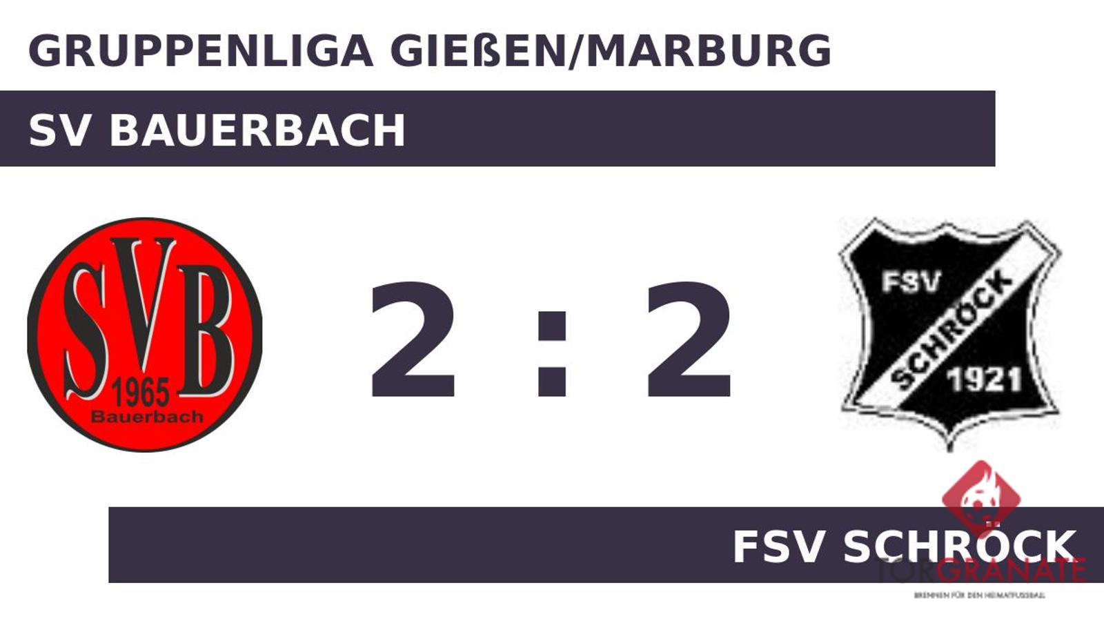 Kaum war das Spiel angepfiffen, lag der FSV Schröck bereits in Front. Jan Obermann markierte in der dritten Minute die Führung. Bis zur Halbzeit änderte sich am Stand nichts mehr und so ging es nach dem Pausenpfiff in den Kabinentrakt. Michael Xenokalakis, der von der Bank für Johannes Herbener kam, sollte für neue Impulse beim SV Bauerbach sorgen (60.). In der 65. Minute brachte Jan Lois Kaisinger den Ball im Netz des FSV Schröck unter. Xenokalakis schoss für den SV Bauerbach in der 69. Minute das zweite Tor. In der 76. Minute sicherte Obermann seiner Mannschaft mit dem Ausgleich zum 2:2 das Unentschieden. Damit schoss er bereits seinen zweiten Treffer. Die 2:2-Punkteteilung war letztlich besiegelt, als der Unparteiische Alexander Pächthold (Staufenberg) die Partie nach 90 Minuten abpfiff.