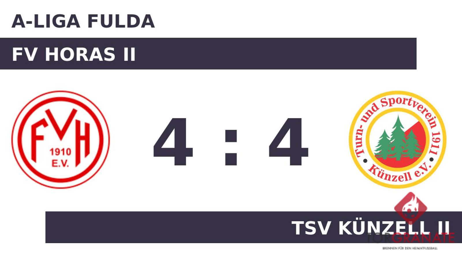 Robert Babich brachte den FV Horas II in der 19. Minute nach vorn. Die passende Antwort hatte Tim Farnung parat, als er in der 22. Minute zum Ausgleich traf. Irfan Sejdovic versenkte die Kugel zum 2:1 (36.). Der FV Horas II führte zur Halbzeit knapp mit einem Tor Vorsprung. In der Halbzeit nahm der TSV Künzell II gleich zwei Wechsel vor. Fortan standen Malte Schramm und Marius Grösch für k.A. k.A. und Marius Müller auf dem Platz. Der TSV kam durch ein Eigentor des FV Horas II in der 59. Minute zum Ausgleich. Der Treffer zum 3:2 sicherte dem FV Horas II nicht nur die Führung – es war auch bereits der zweite von Sejdovic in diesem Spiel (62.). Mund abputzen und weitermachen: Unter diesem Motto stand der Ausgleich, den Erdem Durdu bereits wenig später besorgte (65.). Der TSV Künzell II tauschte zwei etatmäßige Verteidiger: Manuel Seidel ersetzte Mario Bellinger (65.). Jermaine Gensler war zur Stelle und markierte das 4:3 des FV Horas II (67.). Mit seinem Treffer aus der 89. Minute bewahrte Fabio Diegelmann seine Mannschaft vor der Niederlage und machte kurz vor dem Abpfiff das Remis perfekt. Letztlich gingen der FV Horas II und der TSV Künzell II mit jeweils einem Punkt auseinander.