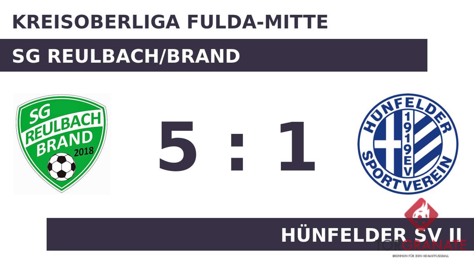 Ein Doppelpack brachte die SG Reulbach/Brand in eine komfortable Position: Johannes Schaub war gleich zweimal zur Stelle (26./29.). Mit dem 3:0 von Christopher Breitung für die SG war das Spiel eigentlich schon entschieden (36.). In der 39. Minute brachte Marvin Rützel das Netz für den Hünfelder SV II zum Zappeln. Die SG Reulbach/Brand baute die Führung aus, indem Jonas Birkenbach zwei Treffer nachlegte (42./44.). Bis zum Schlusspfiff durch Referee Thomas Gram (Burghaun) betrieb der Hünfelder SV II nach einem desolaten ersten Spielabschnitt in Halbzeit zwei Schadensbegrenzung und verhinderte eine noch höhere Pleite. Am Ende hieß es 5:1 zugunsten der SG Reulbach/Brand.