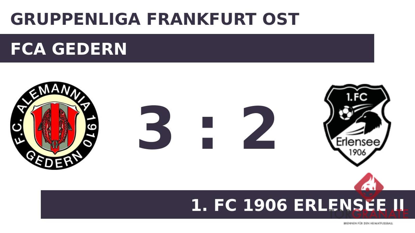 Julius Oechler brachte den FCA Gedern in der 13. Minute in Front. Jannik Jung erhöhte den Vorsprung des Gastgebers nach 23 Minuten auf 2:0. Mats Schlevoigt überwand den gegnerischen Schlussmann zum 3:0 für den FCA Gedern (38.). Wenige Momente vor dem Seitenwechsel war Fabian Luehrs mit dem 1:3 für den 1. FC Erlensee II zur Stelle (42.). Mit der Führung für den FCA Gedern ging es in die Halbzeitpause. In Durchgang zwei lief Denzel Epps anstelle von k. A. für den 1. FC 1906 Erlensee II auf. Epps verkürzte für die Gäste später in der 59. Minute auf 2:3. Ein Debakel, nach dem es zunächst ausgesehen hatte, konnte der 1. FC 1906 Erlensee II noch verhindern. Doch zu etwas Zählbarem kam der 1. FC Erlensee II am Ende nicht mehr.
