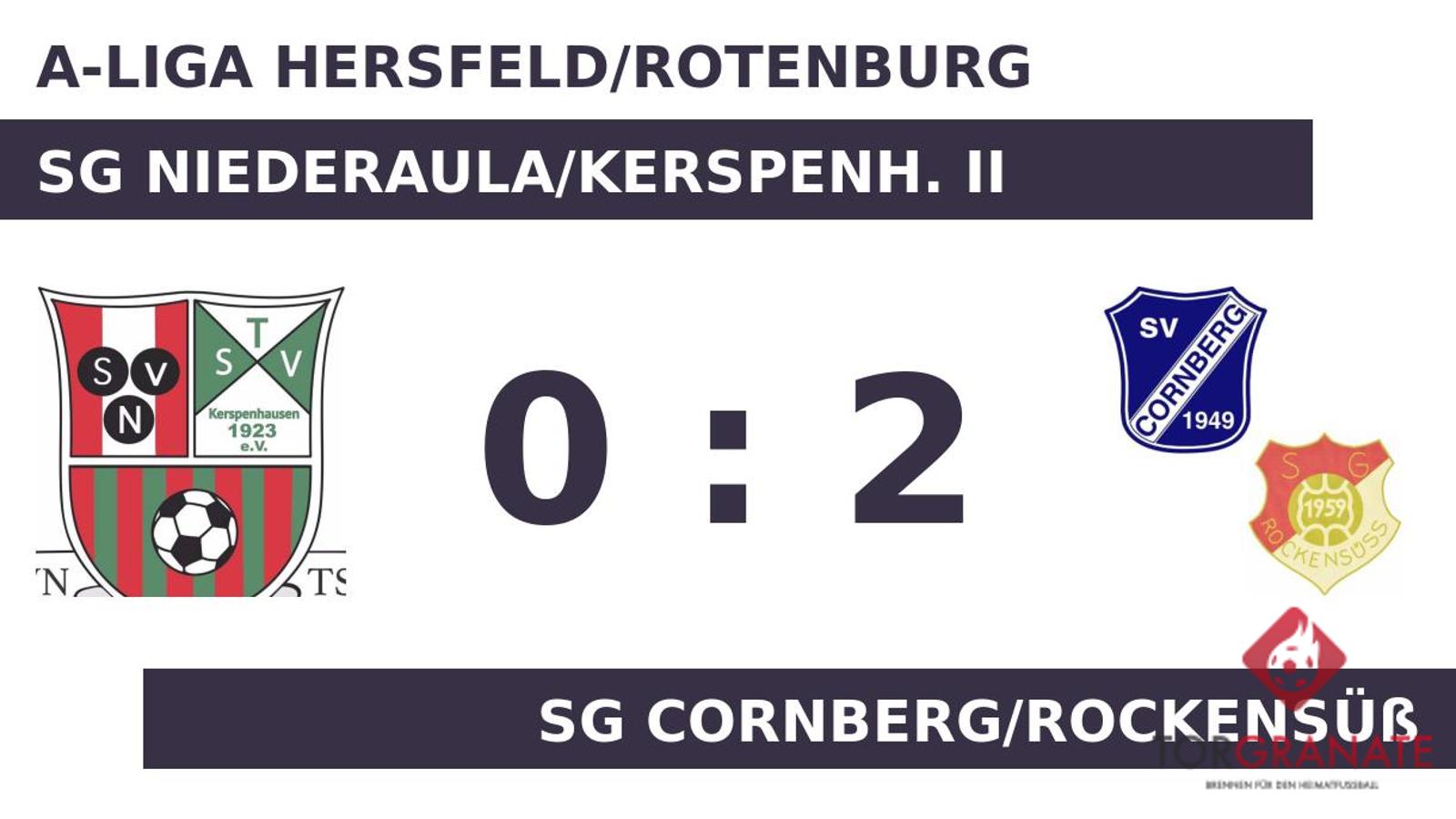 Der Unparteiische setzte mit dem Halbzeitpfiff dem torlosen Treiben auf dem Feld vorläufig ein Ende. Dass die SG Cornberg/Rockensüß in der Schlussphase auf den Sieg hoffte, war das Verdienst von Manuel Toro Moreno, der in der 72. Minute zur Stelle war. Durch ein Eigentor der SG Niederaula/Kerspenh. II verbesserte Cornberg/Rockensüß den Spielstand auf 2:0 für sich (75.). Die 0:2-Heimniederlage von Niederaula/Kersp. II war Realität, als Schiedsrichter Moritz Wendt (Schlitz) die Partie letztendlich abpfiff.
