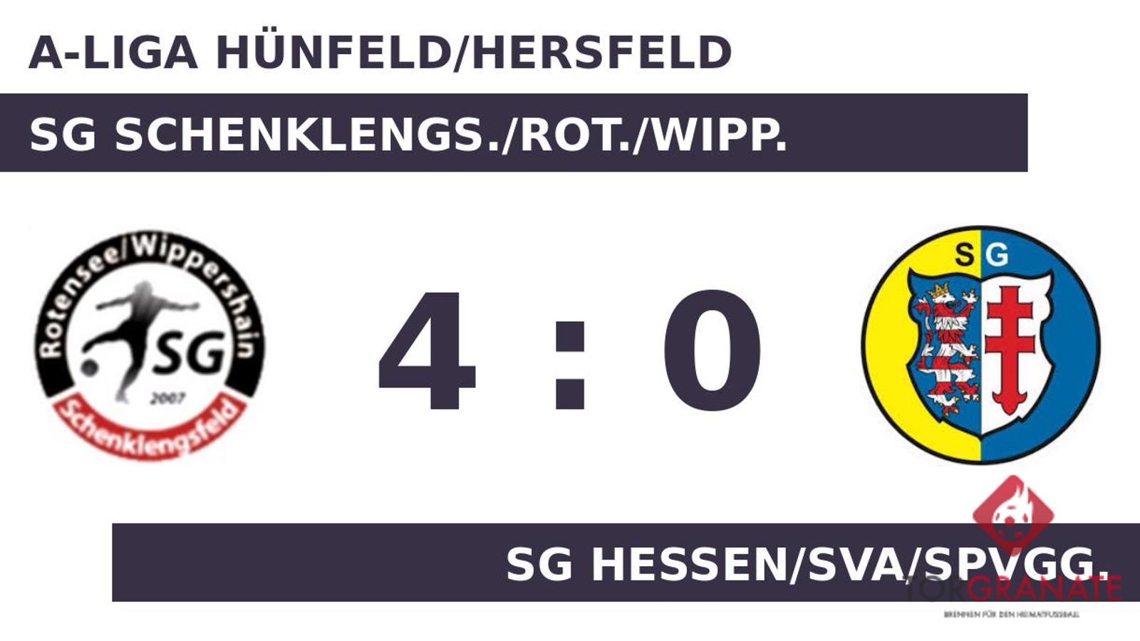 Schenkl./Rot./Wip. erwischte einen Blitzstart ins Spiel. Andre Veselcic traf in der vierten Minute zur frühen Führung. Durch ein Eigentor der SG Hessen/SVA/Spvgg. verbesserte die SG Schenklengs./Rot./Wipp. den Spielstand auf 2:0 für sich (15.). Die Hintermannschaft der SG Hessen/SVA/Spvgg. ließ bis zur Pause kein weiteres Tor zu und es ging bei unverändertem Stand in die Kabinen. Mit dem 3:0 durch Leon Burkhard schien die Partie bereits in der 48. Minute mit Schenkl./Rot./Wip. einen sicheren Sieger zu haben. Eigentlich war die SG Hessen/SVA/Spvgg. schon geschlagen, als Tobias Reinhardt das Leder zum 0:4 über die Linie beförderte (69.). Letztlich kam die SG Schenklengs./Rot./Wipp. gegen den Gast zu einem verdienten 4:0-Sieg.