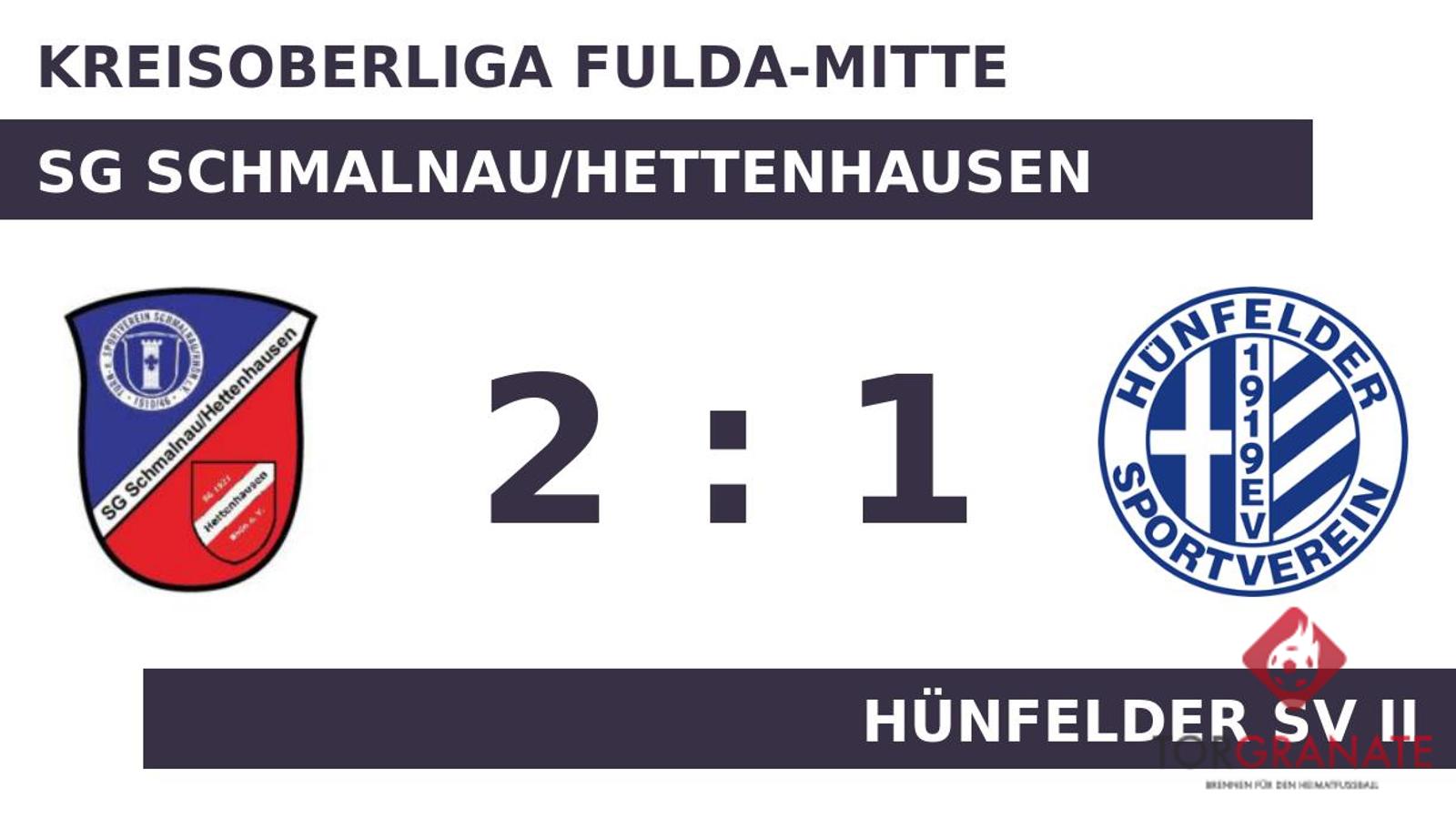 Ein frühes Ende hatte das Spiel für Jean-Pierre Abe vom Hünfelder SV II, der in der elften Minute vom Platz musste und von Tobias Pfeffer ersetzt wurde. Die SG Schmalnau/Hettenhausen ging durch Gyorgi Zarevski in der 15. Minute in Führung. Jure-Ivan Madzar erhöhte für die Spielgemeinschaft auf 2:0 (33.). Der Hünfelder SV II wehrte sich mit allen Mitteln gegen die drohende Niederlage und wechselte mit Stefan Ohneiser einen weiteren nominellen Stürmer für Maurice Pappert ein. Ehe es in die Kabinen ging, markierte Laurin Waider das 1:2 für den HSV (42.). Zur Pause war Schmaln./Hettenh. im Fahrwasser und verbuchte eine knappe Führung. Obwohl dem Gastgeber nach erfolgreicher erster Hälfte keine weiteren Tore gelangen, schaffte es der Hünfelder SV II zugleich nicht, die Partie zu drehen. Sie endete mit dem Halbzeitstand von 2:1.