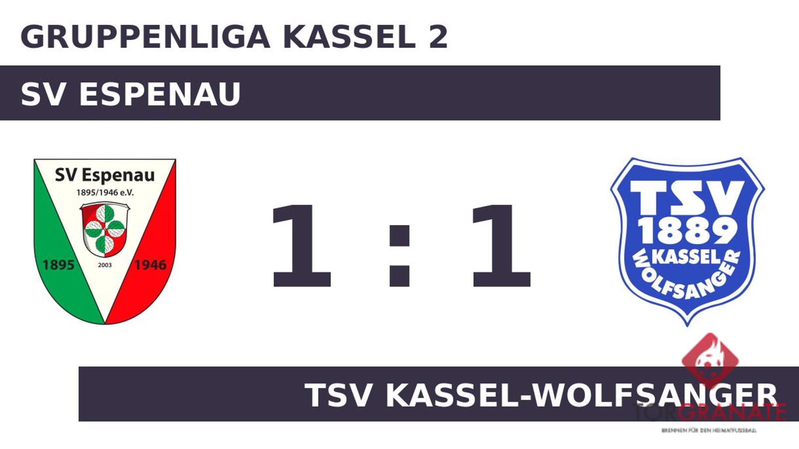 Kaum war das Spiel angepfiffen, lag der TSV Kassel-Wolfsanger bereits in Front. Felix Hegmann markierte in der dritten Minute die Führung. Nach nur 23 Minuten verließ Daniel Krizanovic vom Gast das Feld, Gianluca Urbano kam in die Partie. Mit der knappen Führung des TSV Wolfsanger pfiff der Schiedsrichter zur Halbzeit. Der SV Espenau nahm den nominellen Verteidiger Tobias Mirwald raus. Für ihn kam der etatmäßige Mittelfeldmann Florian Windus, um das Spiel nach vorn zu bringen (81.). Als einige Zuschauer bereits den TSV Kassel-Wolfsanger als Sieger der Begegnung sahen, schlug der Moment von Nico Weller, der zum Ausgleich traf (90.). Am Ende stand es zwischen dem SV Espenau und dem TSV Wolfsanger pari.