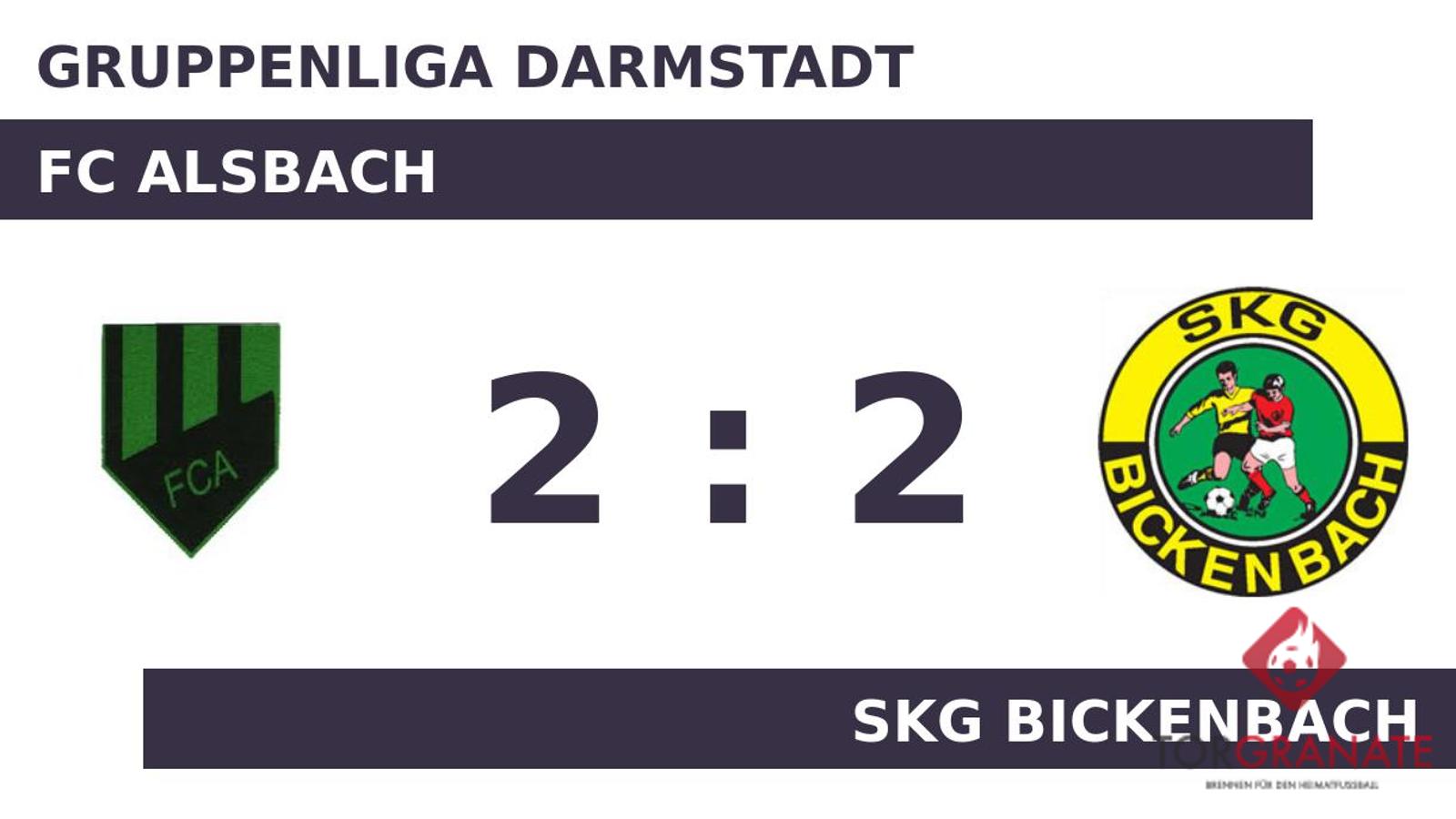 Die Antwort ließ nicht lange auf sich warten. Wenige Augenblicke später besorgte Luke Schwalm den Ausgleich (17.). Auf die vermeintliche Siegerstraße brachte Ole Spiecker sein Team in der 17. Minute. Vor dem Seitenwechsel sorgte Ole Spiecker mit seinem Treffer für eine kalte Dusche für den FC Alsbach. Mit einem Tor Vorsprung für die SKG Bickenbach ging es für die beiden Teams in die Halbzeitpause. Für das zweite Tor des FC Alsbach war Maurice Götz verantwortlich, der in der 68. Minute das 2:2 besorgte. In der 79. Minute stellte der FCA personell um: Per Doppelwechsel kamen Tarik-Ali Aydogan und Timo Seitz auf den Platz und ersetzten Tim Kappermann und Johannes Goetz. Am Ende stand ein Teilerfolg für beide Mannschaften. Die Heimmannschaft und die SKG Bickenbach spielten unentschieden.