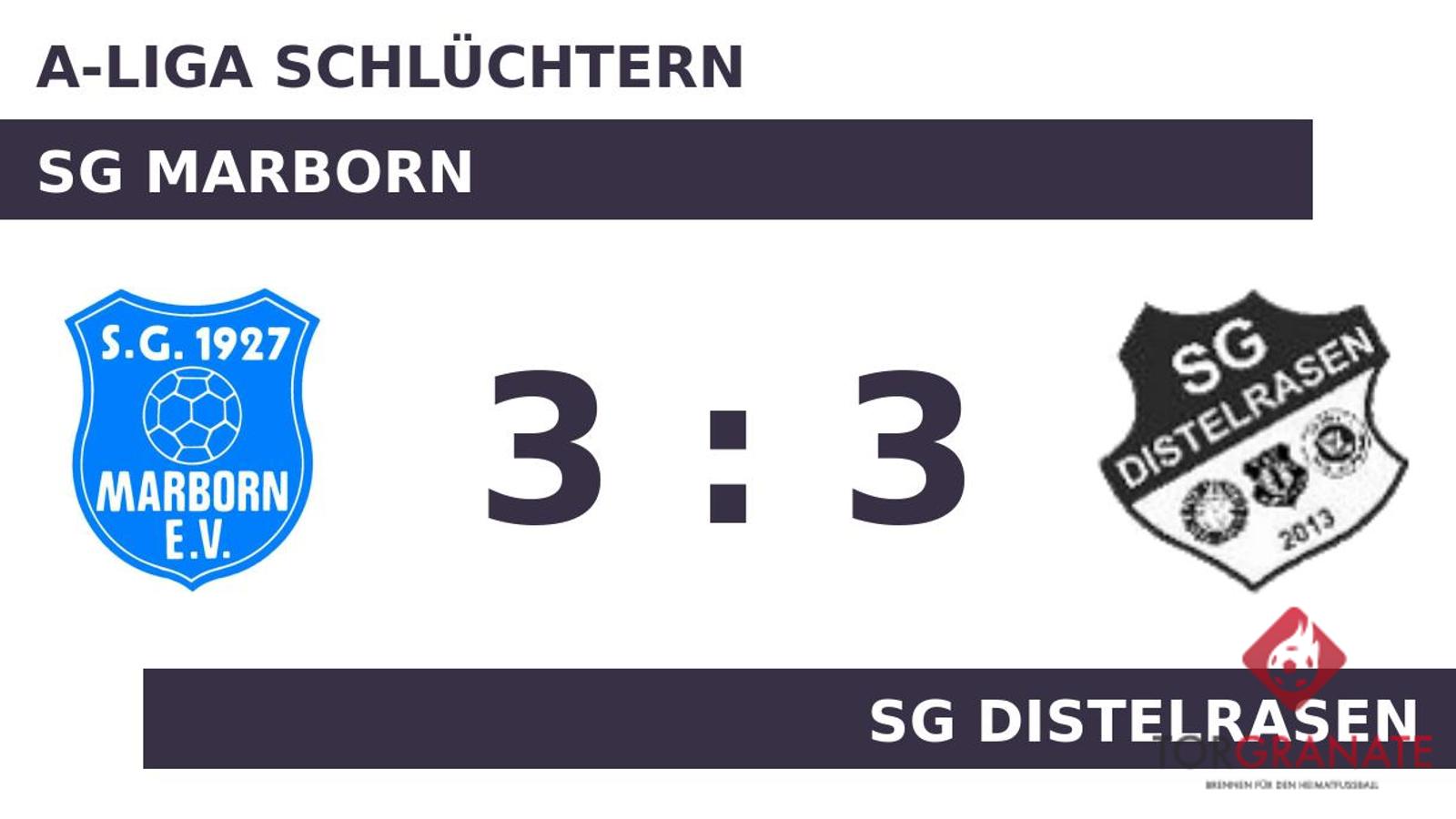 Cedric Dietz brachte die SG Marborn in der 13. Minute ins Hintertreffen. Wenig später verwandelte Leon Schneider einen Elfmeter zum 1:1 zugunsten der SGM (34.). Zur Halbzeit war die Partie noch vollkommen offen. Remis lautete das Zwischenresultat. Enrique Falk machte in der 50. Minute das 2:1 der SG Marborn perfekt. In der 62. Minute war Dietz mit dem Ausgleich zum 2:2 zur Stelle. Damit schoss er bereits seinen zweiten Treffer! Für das 3:2 der SG Marborn zeichnete Falk verantwortlich (75.). Kurz vor dem Ende des Spiels jubelte Johannes Richter mit seinen Teamkollegen über seinen Treffer in der 90. Minute, der einen Gleichstand herbeiführte. Schließlich gingen die SG Marborn und die SG Distelrasen mit einer Punkteteilung auseinander.