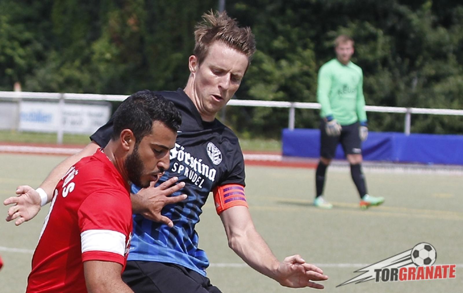 Sebastian Schuch (rechts) durfte sich schon im Testspiel gegen Müs mit der Binde vertraut machen und kennt dieses Gefühl natürlich schon vom Ex-Verein SVA Bad Hersfeld. Foto: Siggi Larbig