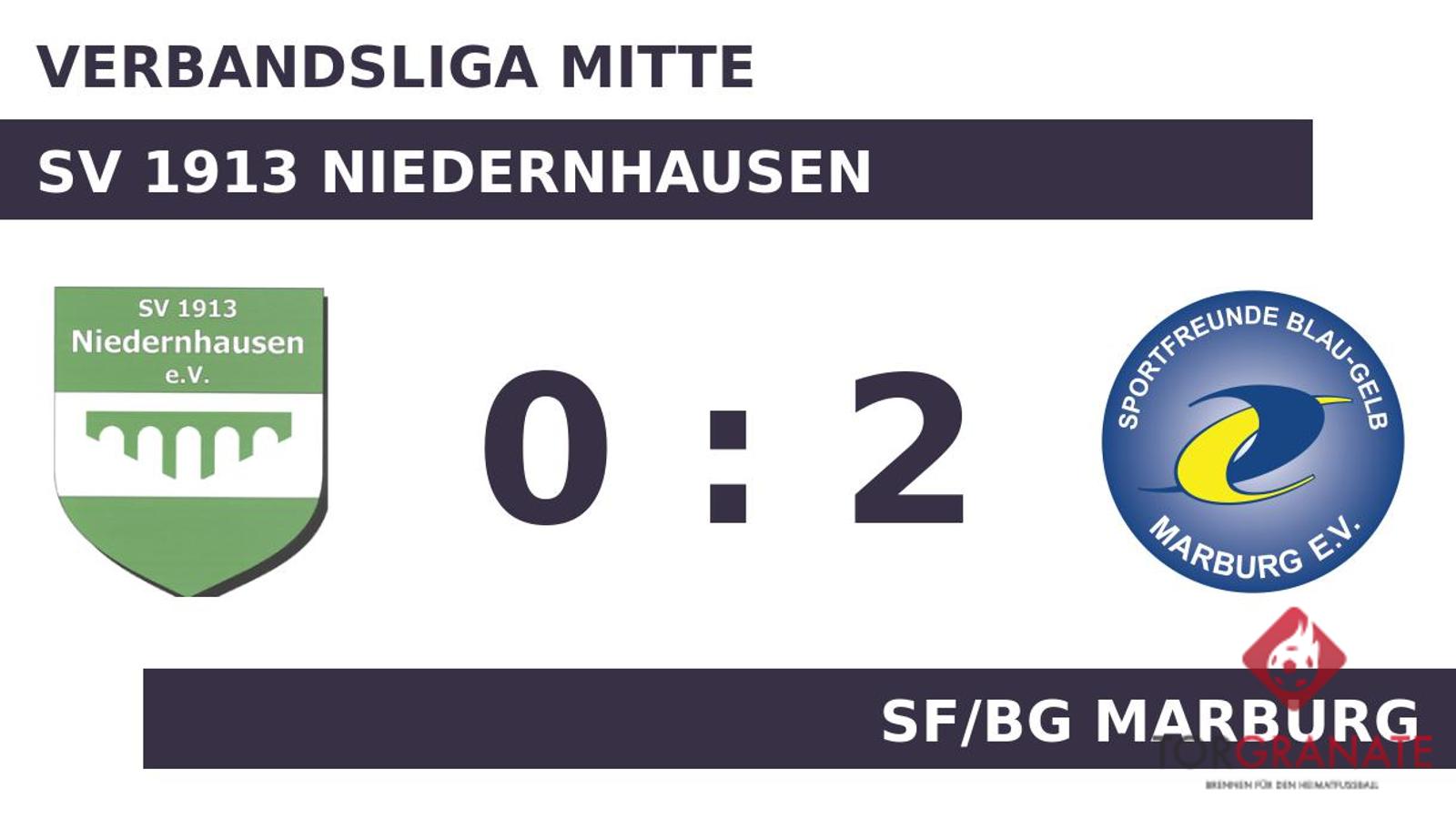 Valentin Nasarov brachte den SV 1913 Niedernhausen in der elften Minute ins Hintertreffen. Sascha Huhn erhöhte für das SF/BG Marburg auf 2:0 (27.). Nach der erfolgreichen ersten Hälfte schickten die Sportfreunde Blau-Gelb mit Hannes Schneider einen frischen Spieler für Clemens Haberzettl auf das Feld. Der Schiedsrichter schickte schließlich beide Mannschaften ohne weitere Änderung am Spielstand in die Kabinen. Beim SV Niedernhausen kam zu Beginn der zweiten Hälfte Dominik Ortega Tapia für Gianluca Radtke in die Partie. Den Grundstein für den Sieg über die Heimmannschaft legte das SF/BG Marburg bereits in Halbzeit eins. Da in Durchgang zwei keine weiteren Treffer mehr fielen, war der Pausenstand am Ende auch das Endergebnis.
