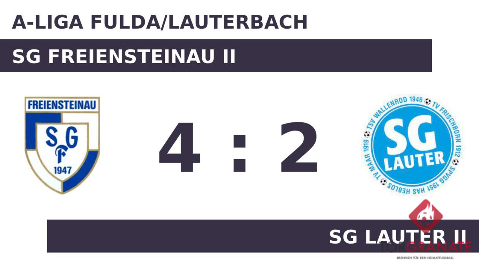 Kaum war das Spiel angepfiffen, lag die SG Lauter II bereits in Front. Paul Seibert markierte in der zweiten Minute die Führung. Andreas Greb beförderte das Leder zum 2:0 der SG über die Linie (30.). Es waren die Gäste, die zur Pause eine Führung ihr Eigen nannten. Sandro Janka war es, der in der 46. Minute den Ball im Gehäuse der SG Lauter II unterbrachte. In der Pause stellte SG Freiensteinau II personell um: Per Doppelwechsel kamen Patrick Staub und Noah Gutschalk auf den Platz und ersetzten Jannik Strassberger und Jonathan Höhn. Die komfortable Halbzeitführung der SG Lauter II hielt nicht bis zum Abpfiff, denn Marcel Muth schoss den Ausgleich in der 60. Spielminute. Die Spielgemeinschaft kam nicht mehr ins Spiel zurück, Laurin Eckl brachte SG Freiensteinau II sogar in Führung (68.). Kurz vor Ultimo war noch Julian Hausmann zur Stelle und zeichnete für das vierte Tor von SG Freiensteinau II verantwortlich (85.). Die SG Lauter II ließ nach dem Wiederanpfiff stark nach und bot SG Freiensteinau II nicht mehr Paroli, sodass das Polster der ersten Halbzeit nicht einmal für ein Unentschieden reichte.
