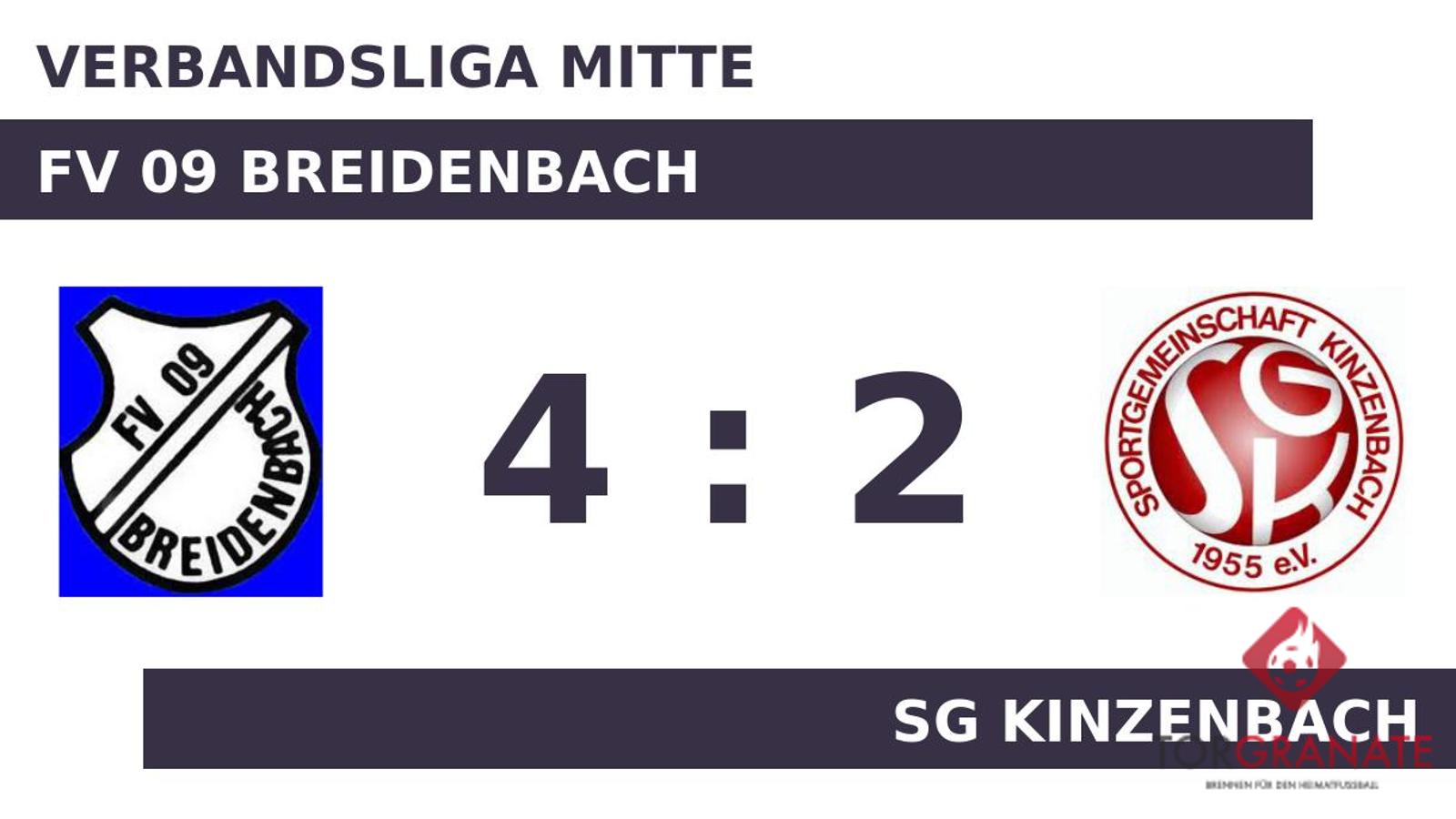 Die SG Kinzenbach erwischte einen Blitzstart ins Spiel. Jarek Herborn traf in der fünften Minute zur frühen Führung. Für das erste Tor des FV 09 Breidenbach war Luca Vogel verantwortlich, der in der 23. Minute das 1:1 besorgte. Bis zur Pause fiel kein weiteres Tor, sodass das Ergebnis noch Bestand hatte, als sich die Teams in die Pause verabschiedeten. Mit einem schnellen Doppelpack (56./58.) zum 3:1 schockte Emil Hallermann die SG Kinzenbach. Natnael Tega verkürzte für die Sportgemeinschaft später in der 67. Minute auf 2:3. Wenig später kamen Felix Hoerr und Gabriel Birol per Doppelwechsel für Kilian Parson und Michael Ray Bathomene auf Seiten der Kinzenbacher ins Match (70.). Moritz Filipzik verwandelte in der 90. Minute einen Elfmeter und baute den Vorsprung des FV 09 Breidenbach auf 4:2 aus. Nach Beendigung der zweiten Halbzeit hieß das Ergebnis 4:2 zugunsten der Nullneuner.