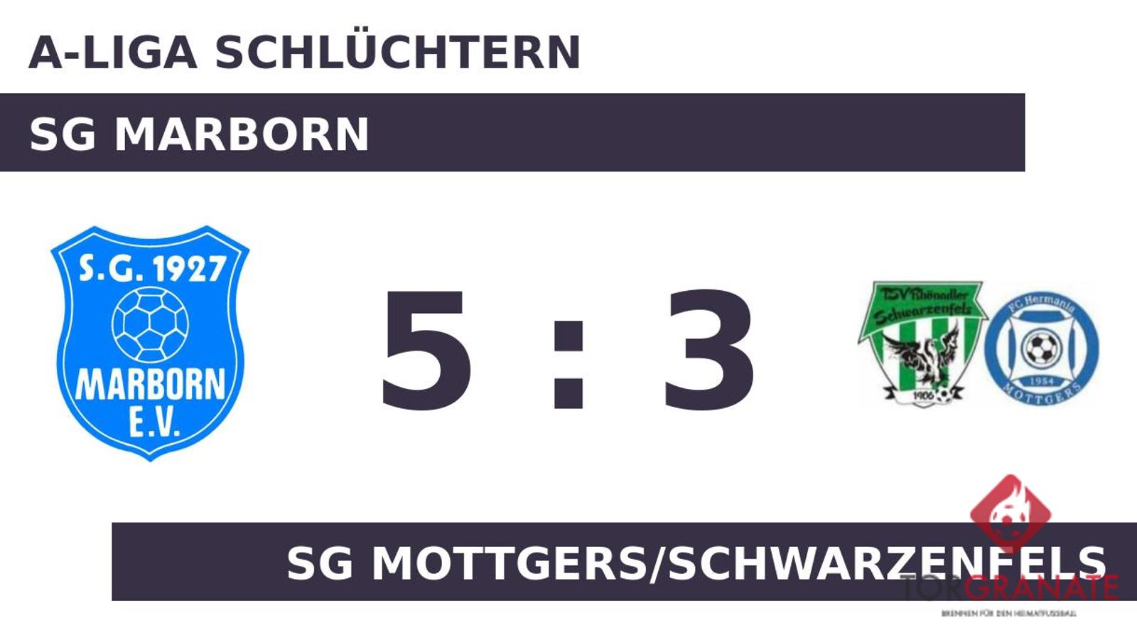 Wenig später verwandelte Leon Schneider einen Elfmeter zum 1:0 zugunsten der SG Marborn (24.). In der 27. Minute brachte Oliver Glaschke das Netz für die SGM zum Zappeln. Das 1:2 der SG Mottgers/Schwarzenfels stellte Tristan Zeller sicher (32.). Daniel Petrovic erhöhte den Vorsprung der SG Marborn nach 38 Minuten auf 3:1. Mit der Führung für die Marborner ging es in die Halbzeitpause. Per Elfmeter erhöhte Schneider in der 52. Minute seine Torausbeute an diesem Tag auf zwei Treffer – 4:1 für die Gastgeber. Eine starke Leistung zeigte Zeller, der sich mit einem Doppelpack für Mottgers/Schwarzenf. beim Trainer empfahl (56./60.). Petrovic stellte wenige Minuten vor dem Schlusspfiff den Stand von 5:3 für die SG Marborn her (90.). Mit dem Schlusspfiff durch den Unparteiischen Andreas Böck (Steinau) gewann die SG Marborn gegen die SG Mottgers/Schwarzenfels.