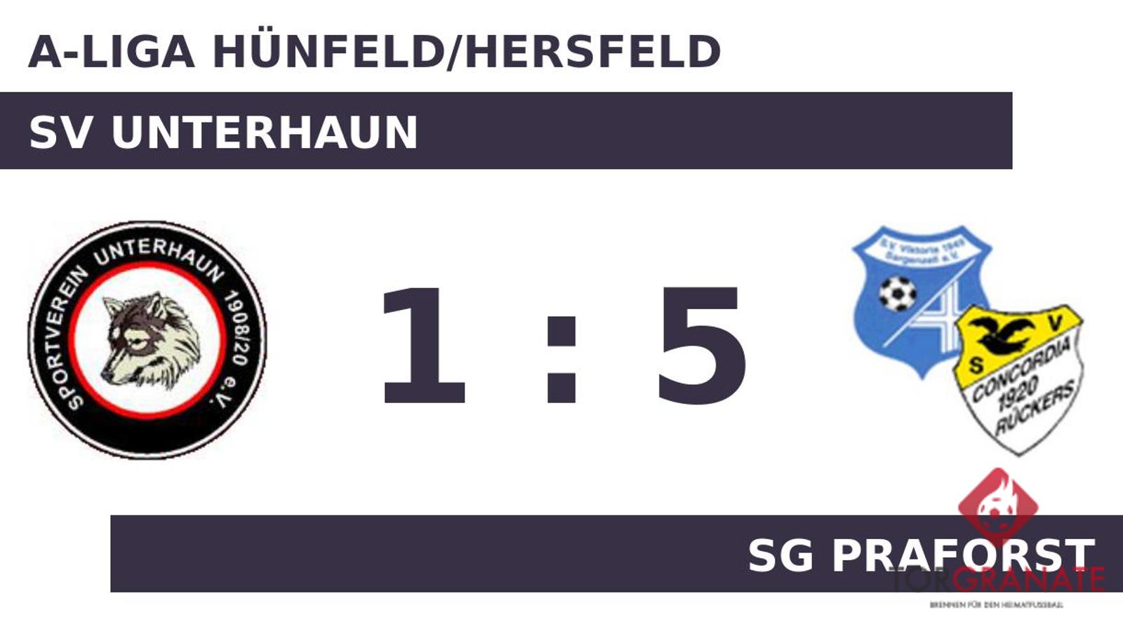 In der 22. Minute verwandelte Jonas Heller einen Elfmeter zum 1:0 für die SG. Die Antwort ließ nicht lange auf sich warten. Wenige Augenblicke später besorgte Lucas Führer den Ausgleich (23.). Das letzte Tor der turbulenten Startphase markierte David Giebel in der 26. Minute. Die SG Praforst führte zur Halbzeit knapp mit einem Tor Vorsprung. Mit einem Wechsel – Simon Schuhmann kam für Miro Kümmel – startete der SV Unterhaun in Durchgang zwei. Florian Völker erhöhte den Vorsprung der SG Praforst nach 48 Minuten auf 3:1. Mit dem 4:1 von Dennis Mehler für die Spielgemeinschaft war das Spiel eigentlich schon entschieden (52.). Eigentlich war der SV Unterhaun schon geschlagen, als Völker das Leder zum 1:5 über die Linie beförderte (55.). Wenig später kamen Leonard Christen und Tobias Scheidel per Doppelwechsel für Dennis Trost und Tim Söllner auf Seiten der Wölfe ins Match (56.). Mit dem Ende der Spielzeit strich die SG Praforst gegen den SVU die volle Ausbeute ein.