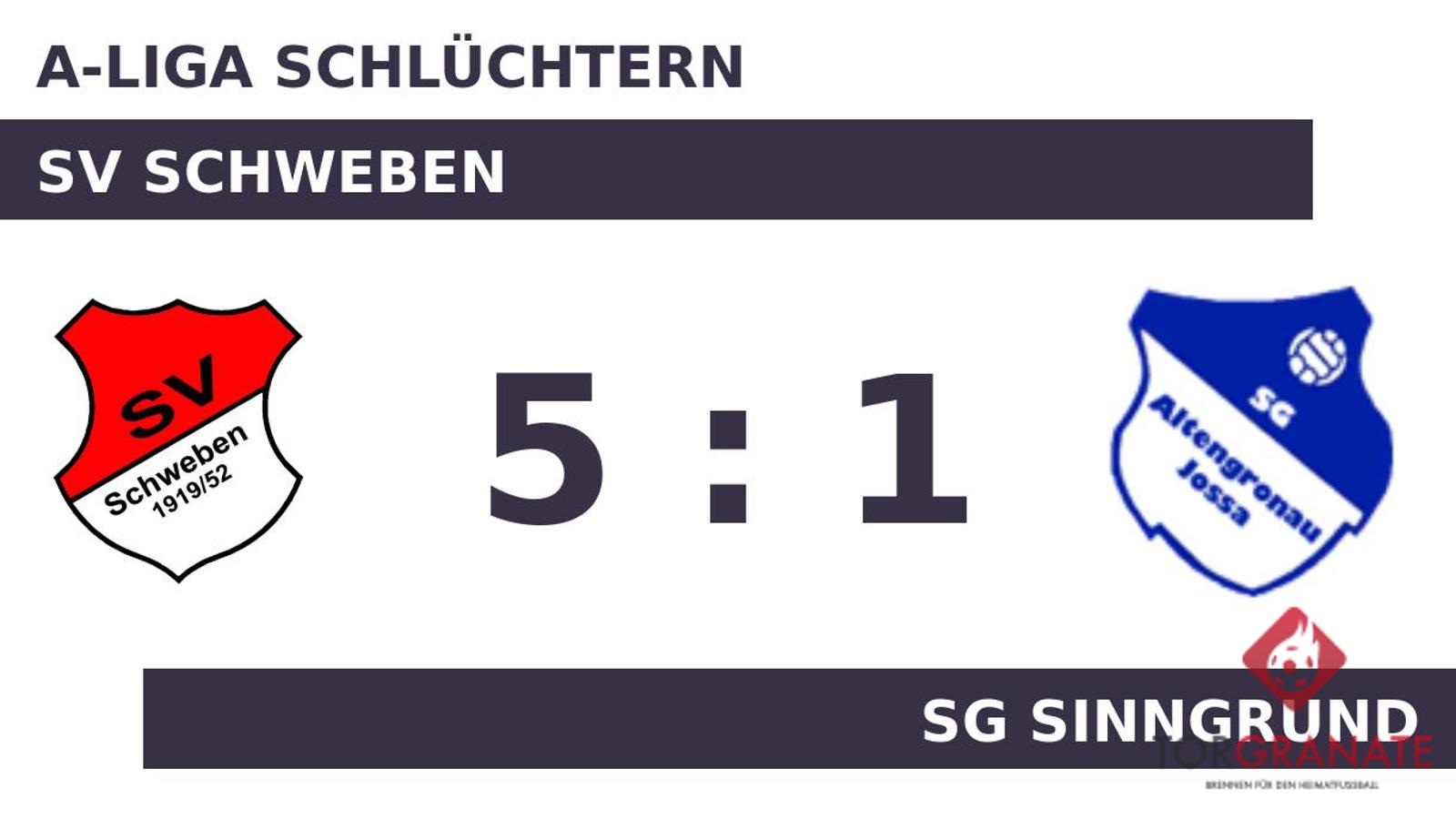 Das erste Tor des Spiels ging an den SVS. Allerdings gelang dies nur mithilfe von SG Sinngrund: 1:0 für den SV Schweben durch ein Eigentor in der 24. Minute. In der 32. Minute erhöhte Moritz Heil auf 2:0 für den SV Schweben. Sander Betz nutzte die Chance für die SG Sinngrund und beförderte in der 37. Minute das Leder zum 1:2 ins Netz. Bei der SG kam zu Beginn der zweiten Hälfte Jannik Stenglein für Paul Bendisch in die Partie. Im ersten Durchgang hatte der SV Schweben etwas mehr Zug zum Tor und ging mit einem knappen Vorsprung in die Kabine. Für das 3:1 der Schwebener zeichnete Carsten Stey verantwortlich (46.). Für ruhige Verhältnisse sorgte Christian Birkenbach, als er das 4:1 für die Heimmannschaft besorgte (71.). Der fünfte Streich des SV Schweben war Florian Storch vorbehalten (84.). Am Ende kam der SV Schweben gegen SG Sinngrund zu einem verdienten Sieg.