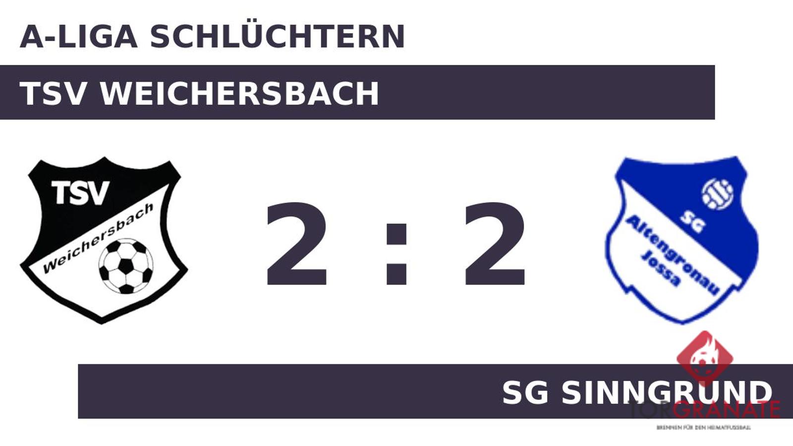 Für den Führungstreffer der SG Sinngrund zeichnete Niklas Kress verantwortlich (23.). Geschockt zeigte sich die TSV Weichersbach nicht. Nur wenig später war Maurice Vogler mit dem Ausgleich zur Stelle (29.). Ohne dass sich am Stand noch etwas geändert hatte, verabschiedeten sich beide Mannschaften zur Pause in die Kabinen. Simon Deuker versenkte die Kugel zum 2:1 (52.). Philip Hans Sachs traf zum 2:2 zugunsten von SG Sinngrund (78.). Schließlich gingen die TSV Weichersbach und die SG Sinngrund mit einer Punkteteilung auseinander.