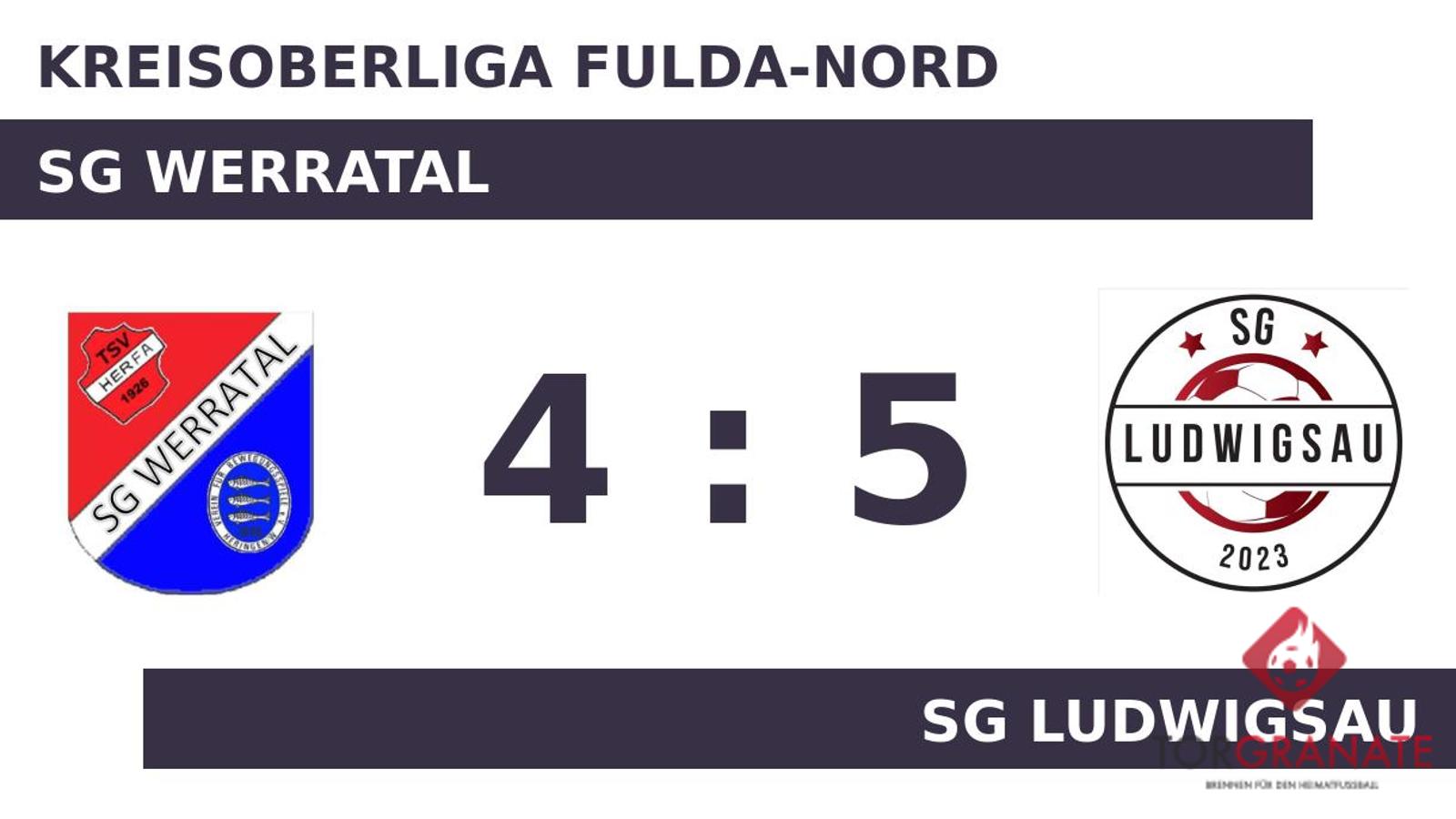 Auf die vermeintliche Siegerstraße brachte Tapdig Aliyev sein Team in der 21. Minute. Nach nur 21 Minuten verließ Pascal Augustin von der SG Ludwigsau das Feld, Marvin Röth kam in die Partie. Für das 2:0 der SG Werratal zeichnete Tobias Leder verantwortlich (24.). Die Einwechslung von Alexander Stroscherer, welcher für Marek Froehlich kam, sollte die SG Ludwigsau wachrütteln (26.). Stroscherer war zur Stelle und markierte das 1:2 des Gasts (33.). Kurz vor dem Halbzeitpfiff (42.) baute Alin Cotan die Führung der SG Werratal aus. Mit der Führung für die Werrataler ging es in die Kabine. Alexander Deringer verwandelte in der 49. Minute einen Elfmeter und baute den Vorsprung des Heimteams auf 4:1 aus. Die SG Ludwigsau verkürzte den Rückstand in der 60. Minute durch einen Elfmeter von Max Eisel auf 2:4. Es folgte der Anschlusstreffer für den Tabellenletzten – bereits der zweite für Stroscherer. Nun stand es nur noch 3:4 (69.). Der Schlusspfiff war zum Greifen nah, als Sebastian Kraft noch einen Treffer parat hatte (90.). Mit dem Abpfiff des Schiedsrichters Harald Euler (Schlitz) hatte die SG Werratal das Polster der ersten Hälfte verspielt, sodass es letzten Endes nicht einmal für ein Unentschieden reichte.