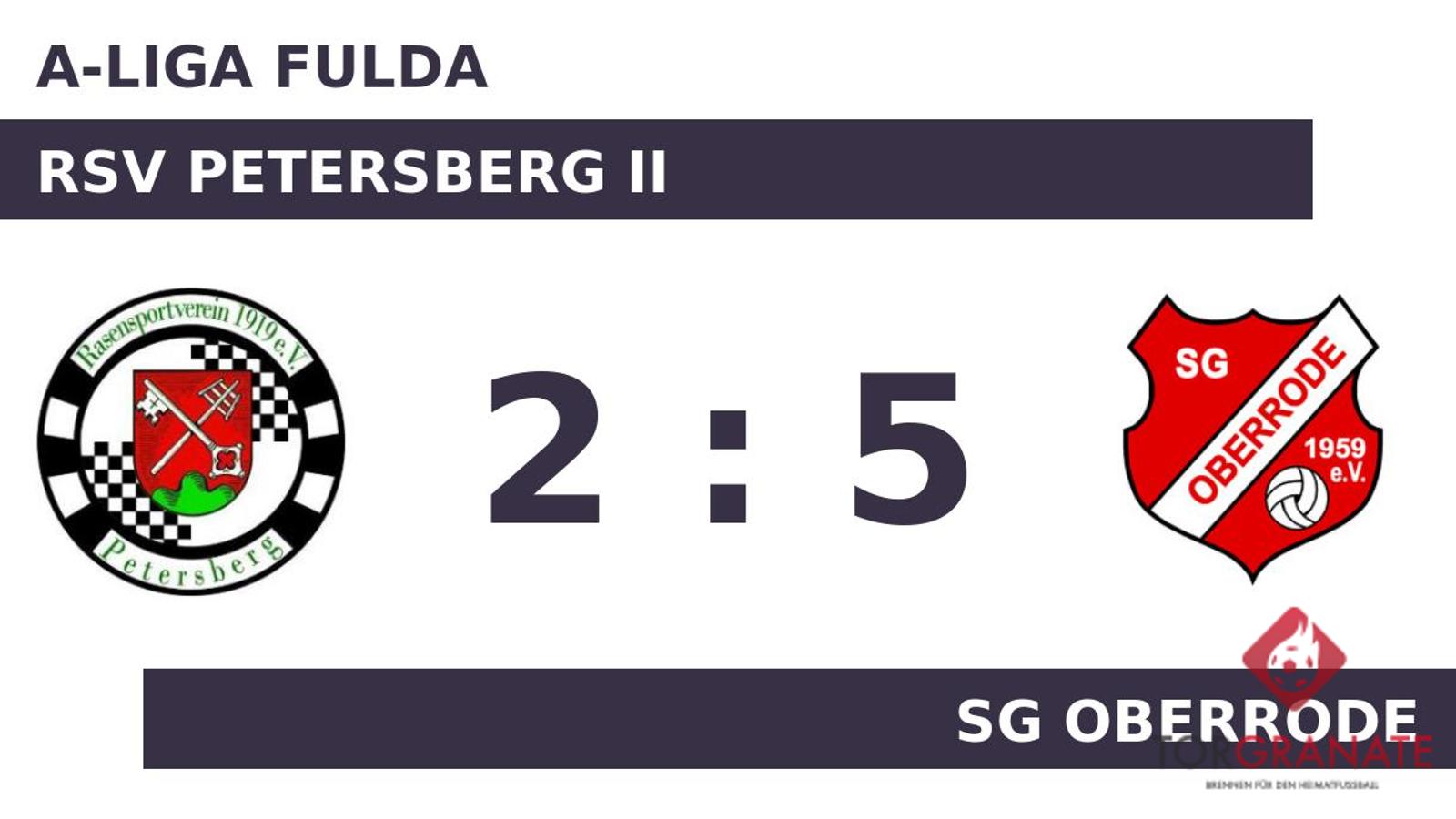 Die SG ging durch Mario Martinez in der 18. Minute in Führung. Nach nur 27 Minuten verließ Maurice Maurischat vom RSV Petersberg II das Feld, Mohammed Gadiaga kam in die Partie. Gianluca Möser schoss für den RSV in der 28. Minute das erste Tor. Marcel Schneider verwandelte in der 45. Minute einen Elfmeter und brachte der SG Oberrode die 2:1-Führung. Nach der Pause ging das Spiel ohne Tom Hillenbrand weiter, dafür stand nun Till Blumenthal bei den Oberroder auf dem Feld. Weitere Tore blieben bis zum Pfiff des Schiedsrichters aus. Somit ging es mit einem unveränderten Stand in die Halbzeitpause. Mit einem schnellen Doppelpack (54./56.) zum 4:1 schockte Martinez den RSV Petersberg II. Semere Debas Gerzgiher verkürzte für die Petersberger später in der 68. Minute auf 2:4. Timo Mau schraubte das Ergebnis in der 75. Minute mit dem 5:2 für die SG Oberrode in die Höhe. Mit dem Ende der Spielzeit strich die SG Oberrode gegen den RSV Petersberg II die volle Ausbeute ein.