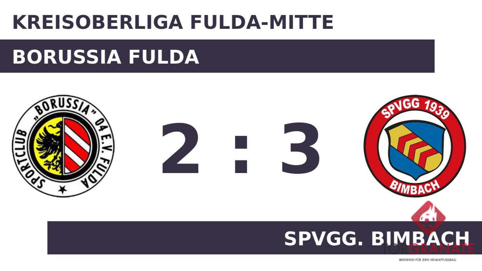 Die Borussia geriet schon in der siebten Minute in Rückstand, als Denis Erovic das schnelle 1:0 für die Spvgg. Bimbach erzielte. Burak Ilgar erhöhte den Vorsprung der Spvgg. Bimbach nach 18 Minuten auf 2:0. Durch einen von Maurice Barkemeyer verwandelten Elfmeter gelang Borussia Fulda in der 20. Minute der 1:2-Anschlusstreffer. Um den entscheidenden Deut besser war zur Pause die Spvgg. Bimbach, sodass es mit einer dünnen Führung in die Kabine ging. In Durchgang zwei lief Ruben Herrmann anstelle von Alaa Khiraoui für Borussia Fulda auf. Für das 3:1 der Spvgg. Bimbach zeichnete Johannes Stein verantwortlich (51.). In der 66. Minute stellte die Spvgg. personell um: Per Doppelwechsel kamen Mahmoud Attia und Marius Schneider auf den Platz und ersetzten Schneider und Andreas Weisbeck. Jurin Akanouo Tchoffo, der von der Bank für Mark Jaksch kam, sollte für neue Impulse bei Borussia Fulda sorgen (74.). Akanouo Tchoffo ließ sich in der 78. Minute nicht zweimal bitten und verwertete zum 2:3 für den SCB. Am Schluss siegte die Spvgg. Bimbach gegen den Traditionsverein.
