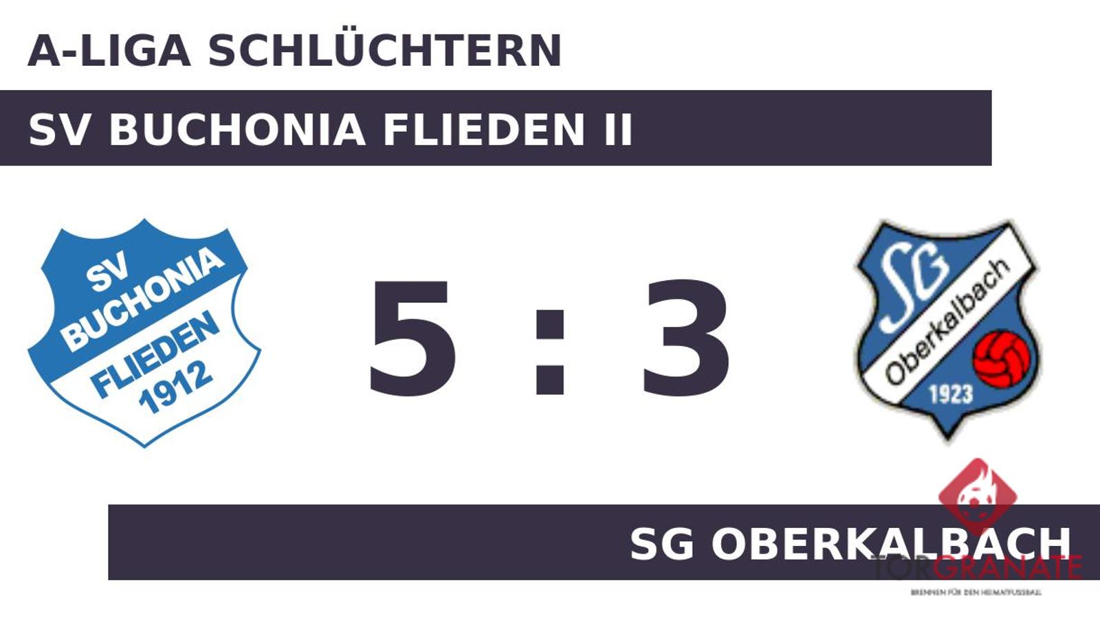 Nils Malkmus brachte den SV Flieden II in der achten Spielminute in Führung. Komfortabel war die Pausenführung der Buchonia nicht, aber immerhin ging der Gastgeber mit einem Tor Vorsprung in die Umkleidekabinen. Das 1:1 der SG Oberkalbach stellte Philip Ommert sicher (48.). Dario Hilgenberg brachte die SGO per Doppelschlag ins Hintertreffen, als er in der 61. und 65. Minute vollstreckte. Für ruhige Verhältnisse sorgte Rafael Best, als er das 4:1 für den SV Buchonia Flieden II besorgte (86.). In der 87. Minute brachte Leon Loeffert das Netz für die SG Oberkalbach zum Zappeln. Kurz vor Ultimo war noch Dzejlan Salkovic zur Stelle und zeichnete für das dritte Tor der Oberkalbacher verantwortlich (90.). Mit dem Tor zum 5:2 steuerte Malkmus bereits seinen zweiten Treffer an diesem Tag bei (90.). Schließlich strich der SV Flieden II die Optimalausbeute gegen die SG Oberkalbach ein.