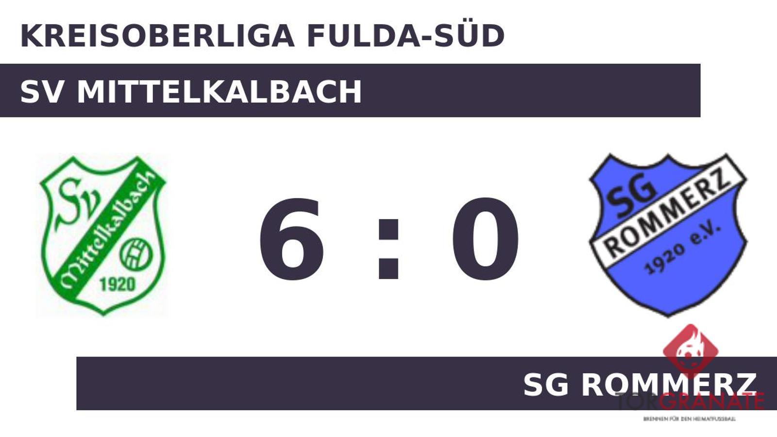 Maxim Koch brachte die SG Rommerz in der 20. Minute ins Hintertreffen. Nach nur 28 Minuten verließ Tom Scheurich von den Rommerzer das Feld, Martin Breunung kam in die Partie. In der 34. Minute brachte Jonas Kreß das Netz für den SV Mittelkalbach zum Zappeln. Die SG Rommerz wehrte sich mit allen Mitteln gegen die drohende Niederlage und wechselte mit Maurice Wroblewski einen weiteren nominellen Stürmer für Moritz Gärtner ein. Weitere Tore blieben bis zum Pfiff des Schiedsrichters aus. Somit ging es mit einem unveränderten Stand in die Halbzeitpause. Maurice Koch gelang ein Doppelpack (48./57.), mit dem er das Ergebnis auf 4:0 hochschraubte. Tobias Herbert vollendete zum fünften Tagestreffer in der 65. Spielminute. Eigentlich war die SG Rommerz schon geschlagen, als Maurice Koch das Leder zum 0:6 über die Linie beförderte (66.). Letztlich feierte der SV Mittelkalbach gegen die SGR nach einer überzeugenden Darbietung einen verdienten 6:0-Heimsieg.