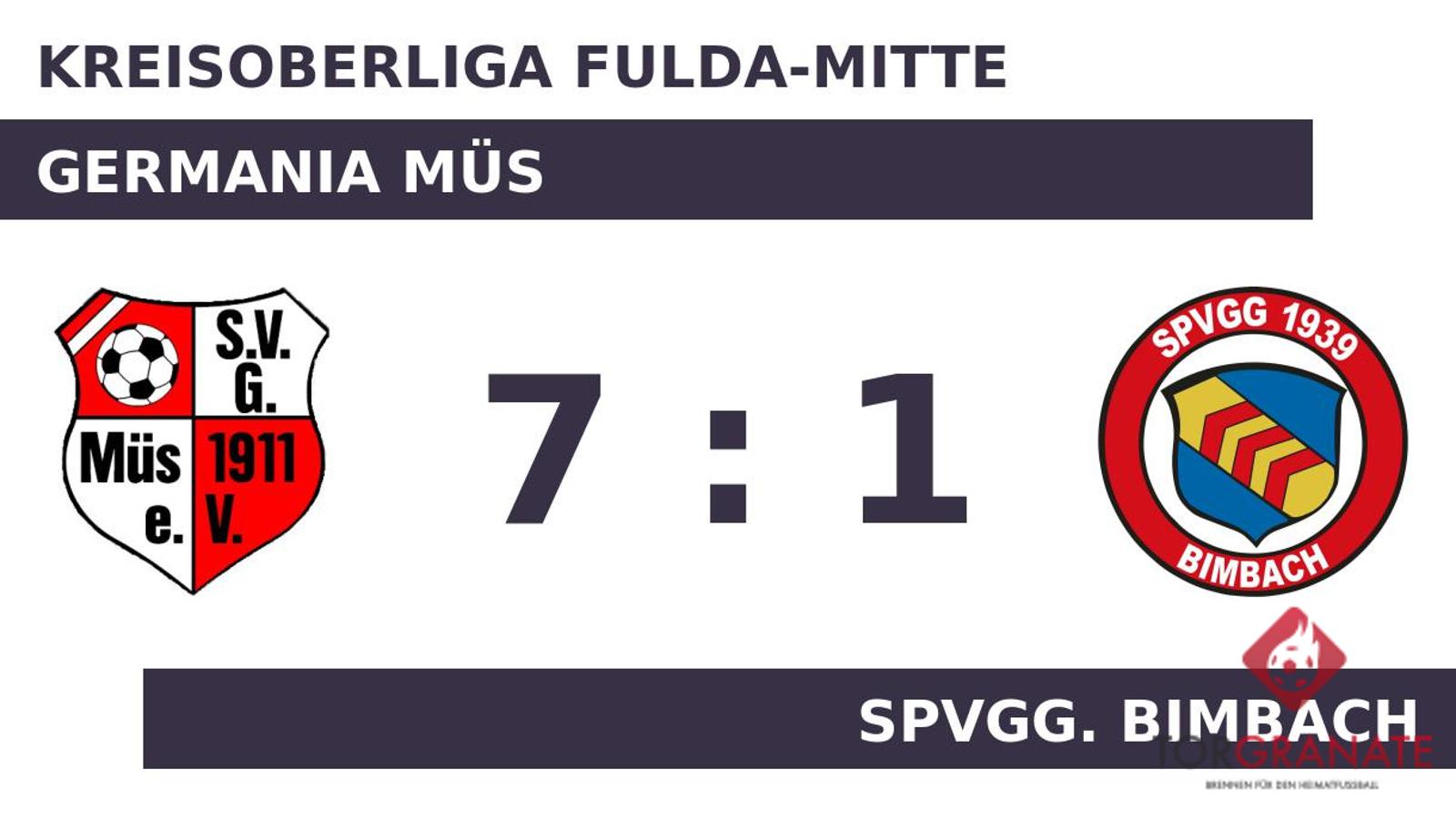 Der SV Müs geriet schon in der zehnten Minute in Rückstand, als Mahmoud Attia das schnelle 1:0 für die Spvgg. Bimbach erzielte. Die passende Antwort hatte Maurice Weitzel parat, als er in der 15. Minute zum Ausgleich traf. Gianluca Goetz stellte die Weichen für Germania Müs auf Sieg, als er in Minute 35 mit dem 2:1 zur Stelle war. Innerhalb weniger Minuten trafen Julian Keller (41.) und Nils Jander (43.). Damit bewies die Germania nochmals die Durchschlagskraft der Offensive. Der SVM dominierte den Gegner zur Pause nach Belieben und ging mit einer deutlichen Führung in die Kabine. Luca Jan Gaertner (50.), Weitzel (65.) und Keller (74.) bauten die komfortable Führung der Müser weiter aus. Schlussendlich setzte sich der Gastgeber mit sieben Toren durch und machte bereits vor dem Seitenwechsel klar, welche Mannschaft als Sieger vom Platz gehen würde.